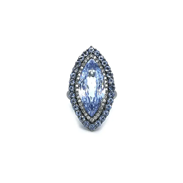 中心主石为天然托帕石 1.10 克拉(1 颗),马眼形切工(22.50 × 10.20 mm),饱和蓝色。**由 28 颗天然托帕石(圆形切工,直径 Ø 3.05 mm)组成的花环/光环(halo)**进一步加深层次。0.38 克拉(38 颗)天然圆形切工钻石(Ø 1.35 mm,白色,净度 SI,颜色 G)带来闪耀与对比。精密镶嵌与色调的互动,成就一枚奢华、醒目且恒久不过时的戒指,成为造型主角。