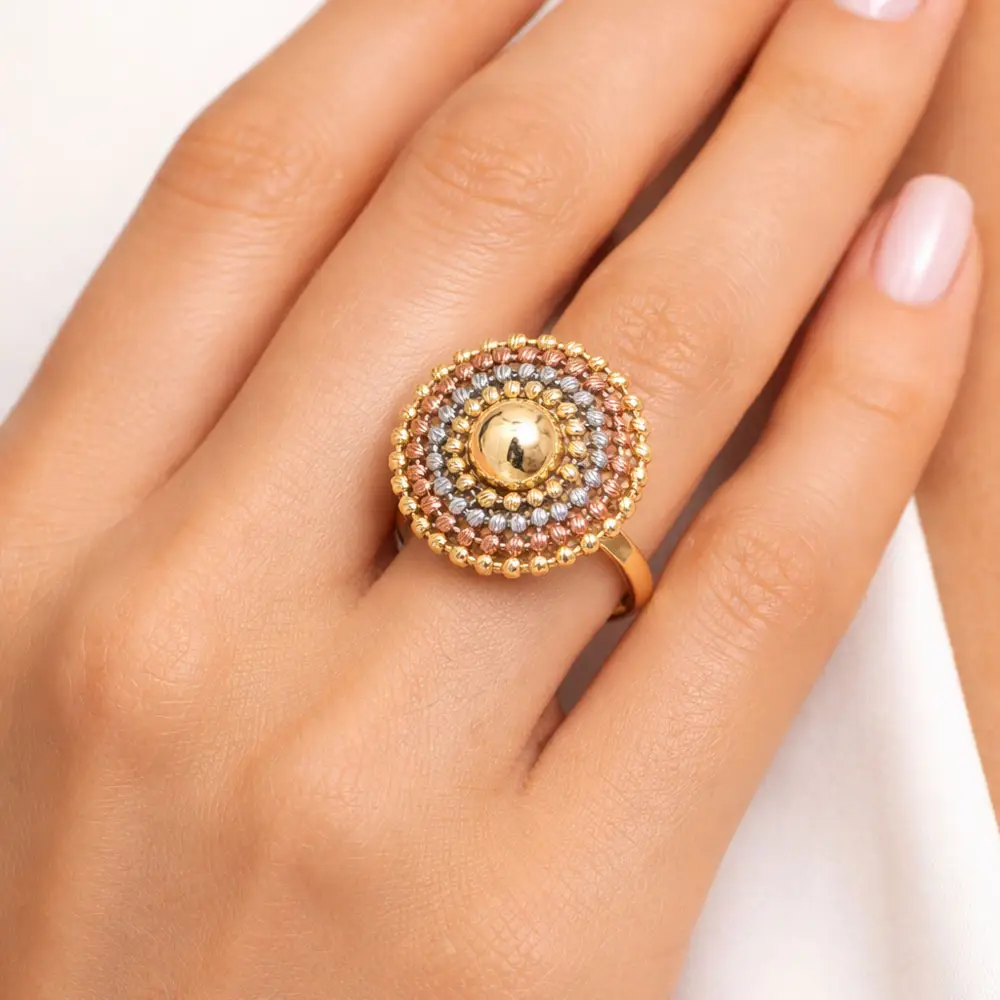 这款引人注目的戒指由 14K 黄、白、玫瑰金巧妙结合而成,呈现丰富的圆形纹理图案。中央的光滑金色圆顶被多层细腻的金珠环绕,营造出精致的立体效果与迷人的光影。戒指犹如一幅优雅的马赛克图案,佩戴于手上格外醒目。