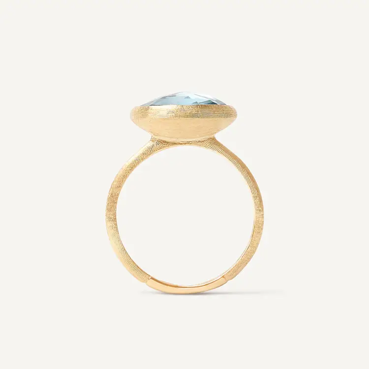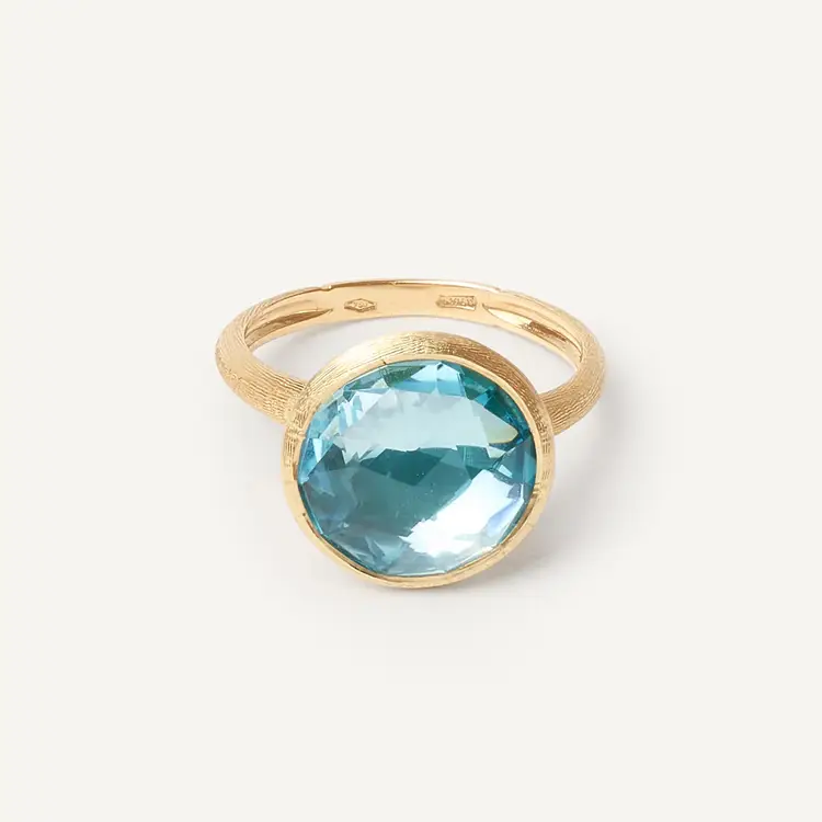Marco Bicego Jaipur AB586 TP01 Y 戒指将经典优雅与醒目宝石融合在一起。它由 18K 黄色黄金 (750/1000) 打造,其表面结合 抛光与哑光处理,呈现细腻的光影纹理。戒指中央镶嵌一颗 天然蓝色黄玉 (topaz),采用 rout / rose 切割,为 圆形 (Round),尺寸为 11 – 12.5 mm,成为戒指的视觉焦点。
