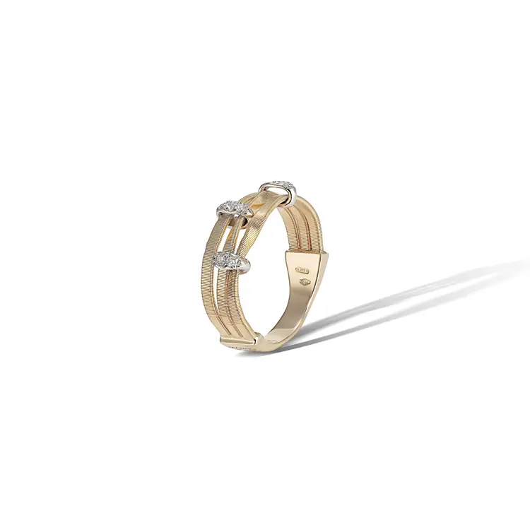 每件作品均由 18K 金 制作,并采用 Marco Bicego 标志性的 手工扭丝工艺 装饰。这一细节赋予珠宝细腻的动感、质感与深度,使其充满生命力与独特性。Marrakech 系列包含 项链、手链、耳环和戒指,常常镶嵌钻石,增添璀璨光芒。