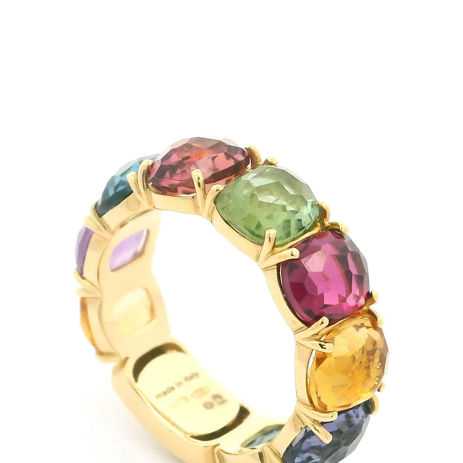 来自 Marco Bicego Murano 系列的这款戒指以精心挑选的多色宝石呈现和谐渐变效果,灵感源自威尼斯的缤纷魅力。每一颗宝石均独立镶嵌于18K黄金之中,并经过切割以强化其色泽、净度与天然光感,形成既俏丽又优雅的色彩组合,是 Murano 系列的设计标志。