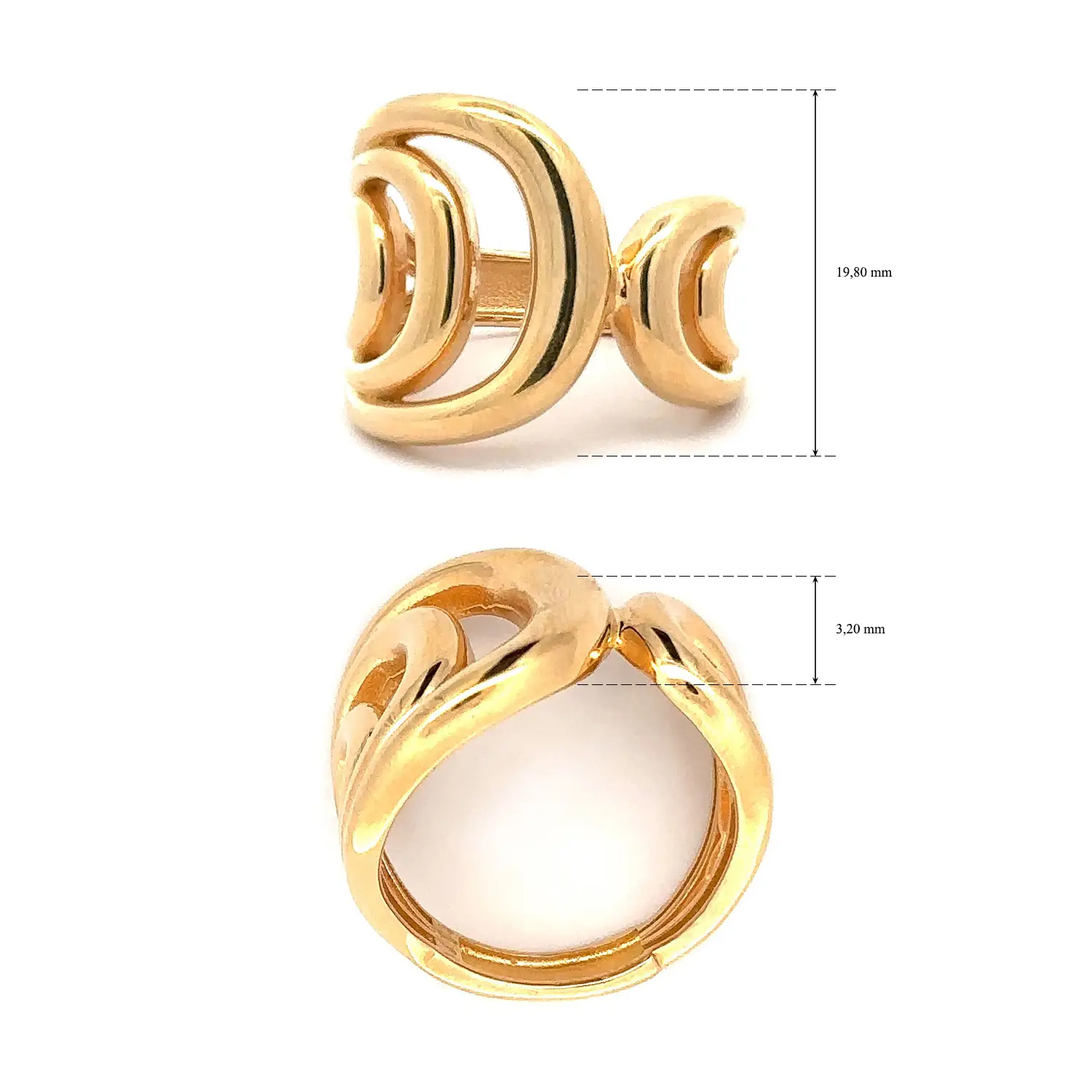 这款独特的戒指以其开放式、有机流线设计而吸引目光,整体造型由优雅的曲线与现代雕塑感构成。两条柔和的波浪状线条环绕手指,形成既动感又和谐的结构,呈现出细腻却富有表现力的视觉效果。高亮抛光的黄金进一步加强了戒指的奢华质感与立体光泽。