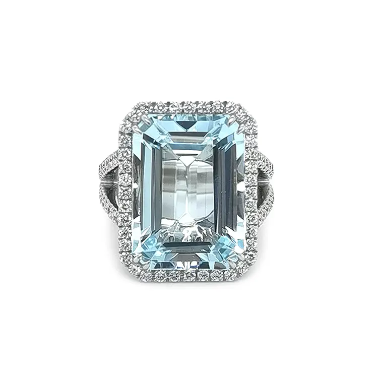 中心主石为天然海蓝宝石 14.22 克拉(1 颗),祖母绿型切工(18.80 × 12.85 mm),清澈蓝色。0.95 克拉(80 颗)天然圆形切工钻石(Ø 1.20 mm,白色,净度 SI,颜色 G)铺镶带来火彩与对比。精密镶嵌凸显海蓝宝石的层次与钻石的璀璨——成就一枚奢华、醒目且恒久不过时的戒指,专为非凡时刻而生。