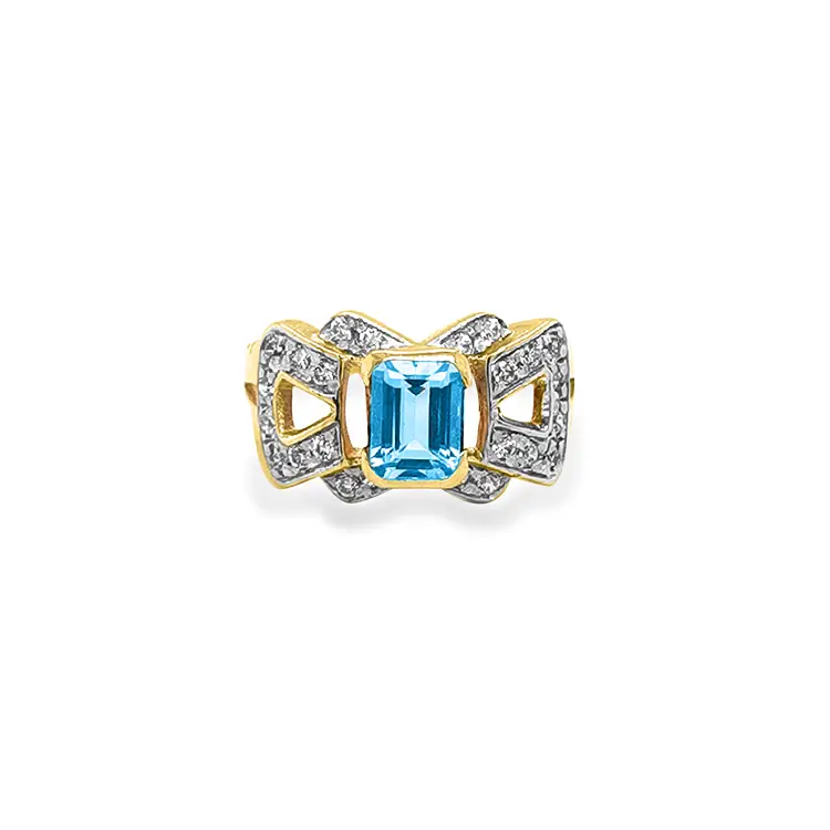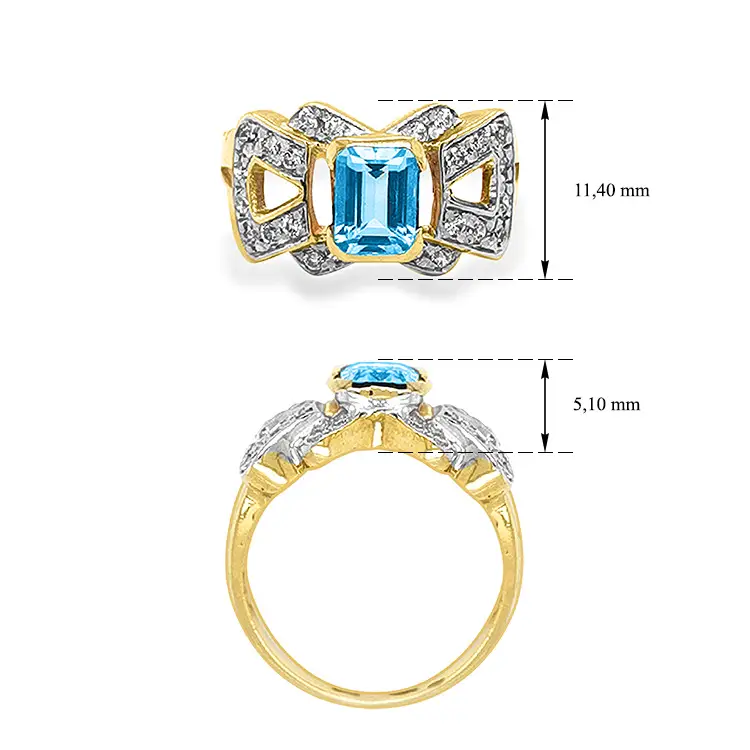 戒指中央镶嵌 1 颗实验室培育海蓝宝石(Akvamarin/Emerald 切割),尺寸 6.90 × 5.10 mm,蓝色清澈透亮。作为 lab-grown(实验室培育)宝石,它拥有鲜艳的色泽和璀璨的光彩,同时兼具环保与道德理念。
