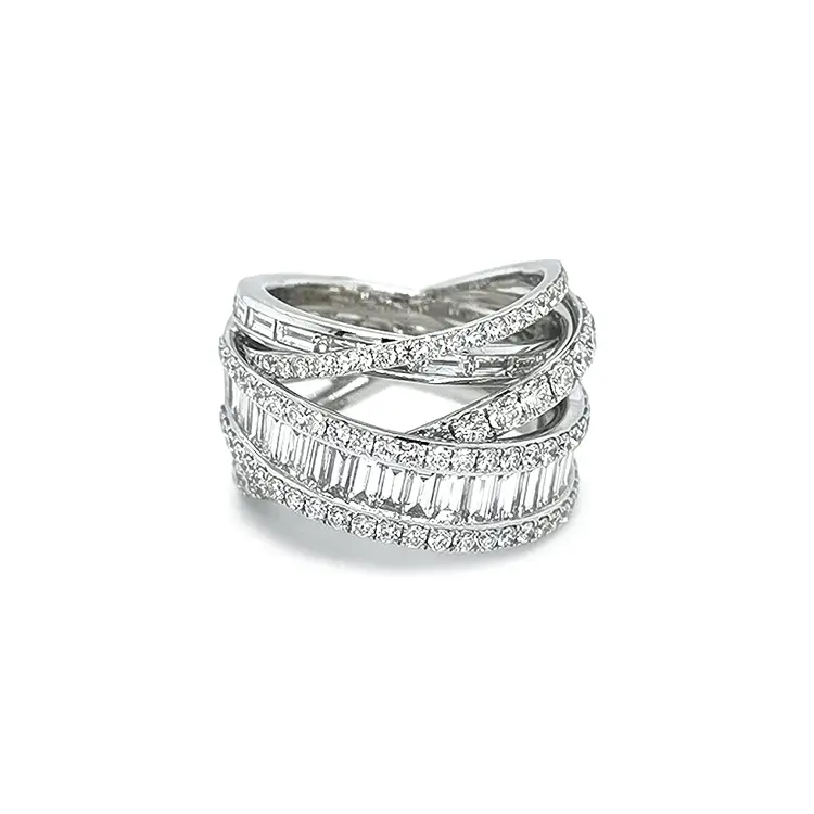 这枚钻石金戒指具有鲜明的Statement气场。采用18K 白金(750/1000)、镜面抛光;戒身结构以14.50 mm 宽、7.00 mm 高的均衡比例呈现。长方形梯方(Baguette)与圆形明亮式的几何组合在指间勾勒出醒目而优雅的线条——风格:Statement。