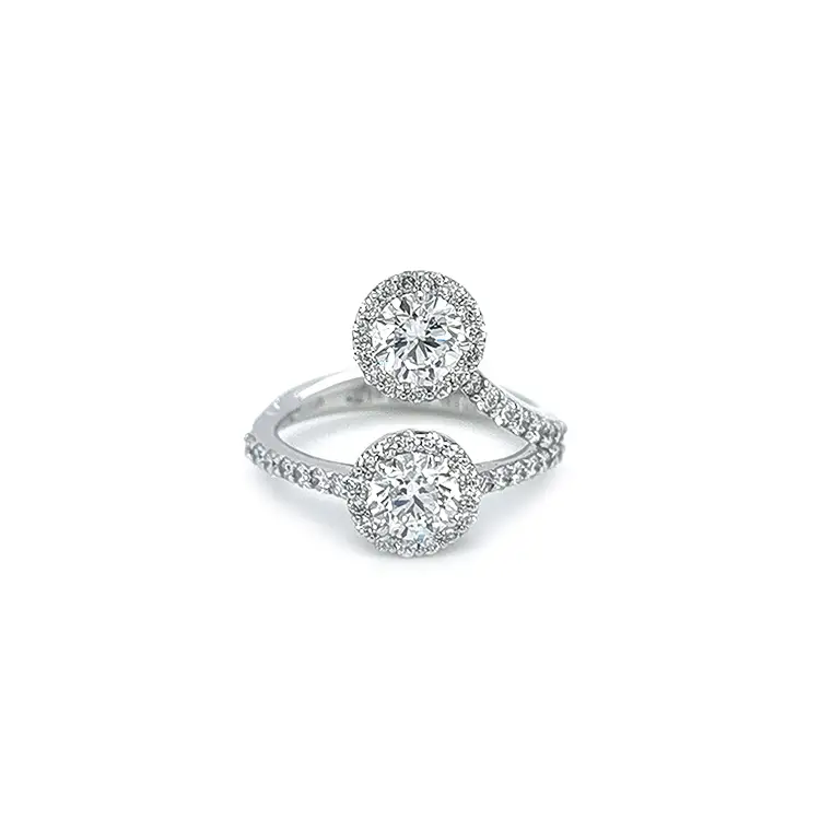 这枚钻石订婚戒指以光环(Halo)的纯粹优雅与双主石的对称美相融。采用18K 白金(750/1000)、镜面抛光;高度 5.90 mm凸显匀称比例。经典恒久的构图,典雅而喜庆——为非凡时刻而生。