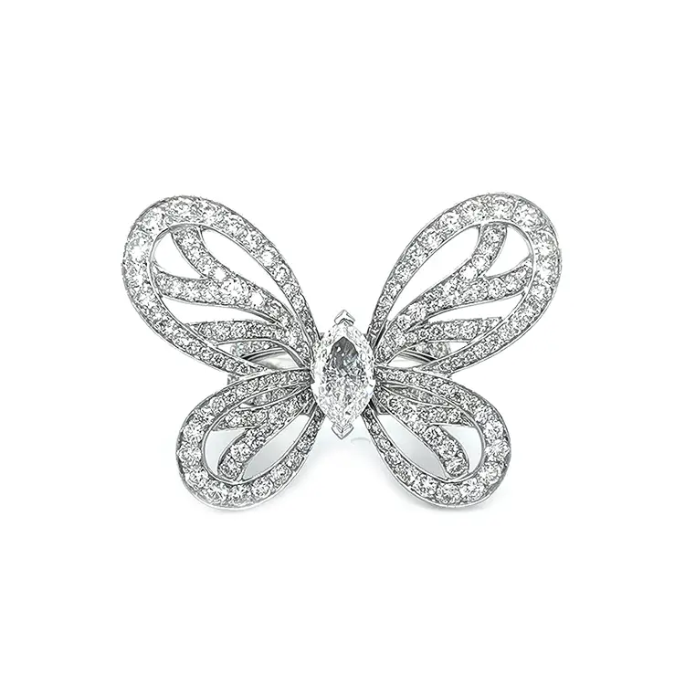 戒指中央镶嵌一颗 马眼形切割天然钻石(10.00 × 5.00 mm,1.02 克拉,颜色 E,净度 VS2)。翅膀部分饰以 130 颗圆形切割天然钻石(总重 3.37 克拉,尺寸 1.70 mm,颜色 G,净度 VS2),光影流转,如同翩翩起舞的蝴蝶。