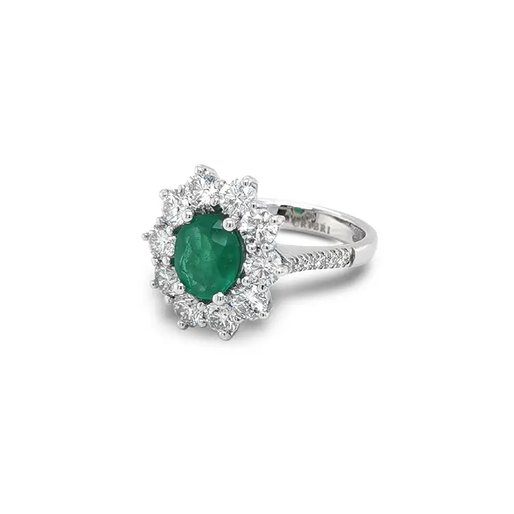 这款 Crieri 祖母绿钻石戒指 展现了自然之美与意大利工艺的完美结合。中央镶嵌一颗 天然祖母绿,重 1.44 克拉,尺寸 8.20 × 6.90 × 4.07 毫米,椭圆切割(Oval),色泽 鲜绿色、浓郁迷人。