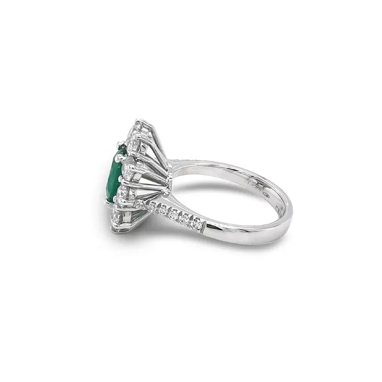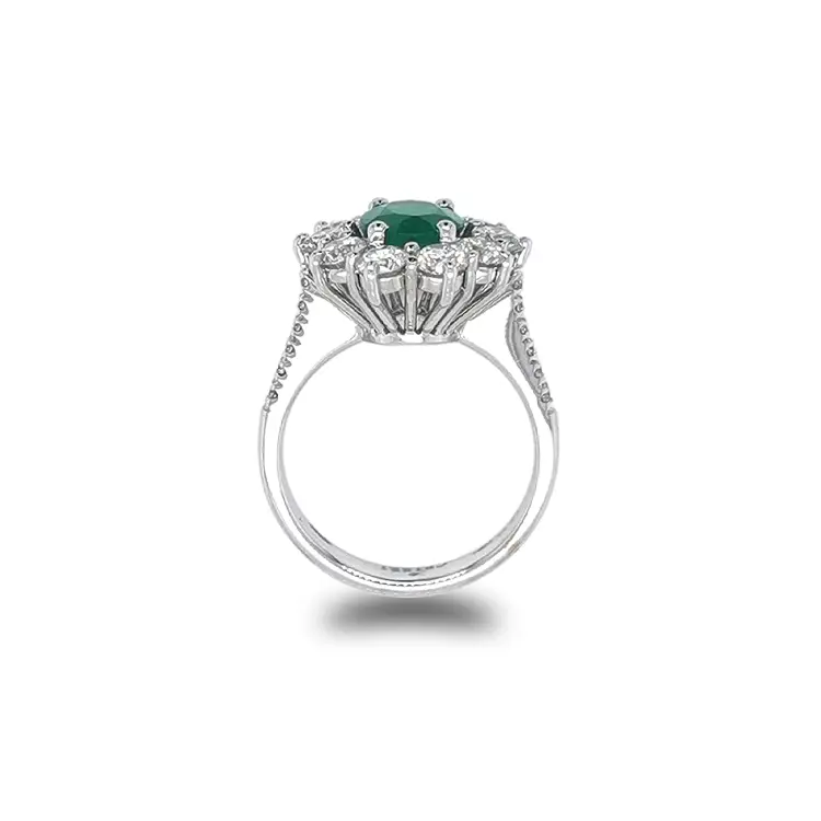 戒指周围环绕 22 颗天然圆形钻石(Round),总重 1.95 克拉,颜色 G,净度 SI,尺寸 1.10–3.50 毫米。钻石的闪耀更衬托出祖母绿的纯粹与深邃。