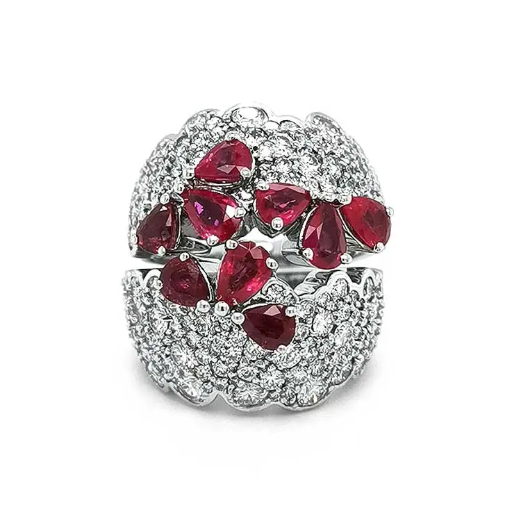 戒指镶嵌 9 颗天然红宝石,总重 3.35 克拉(5.80 × 4.40 毫米),浓郁的红色象征激情与力量。外围环绕 160 颗天然白钻,总重 4.54 克拉(1.90 毫米,G–H 色 / VS 净度),形成耀眼的光环,衬托出红宝石的璀璨光芒。