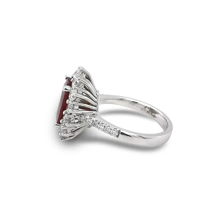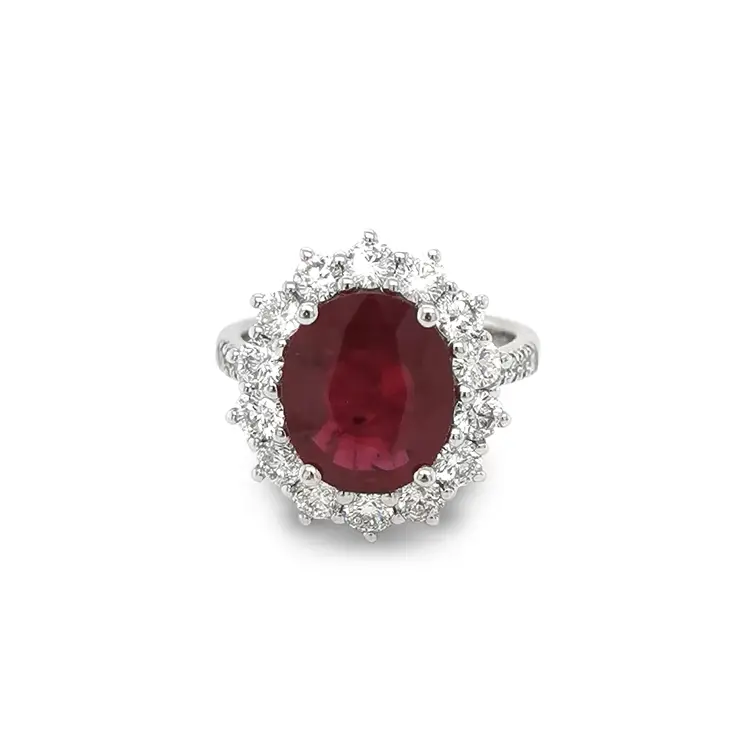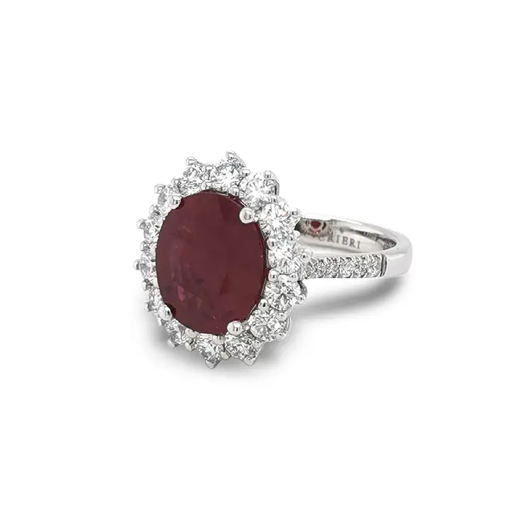 中央镶嵌一颗 天然红宝石,重 4.07 克拉,尺寸 11.53 × 9.74 × 4.19 毫米,采用优雅的 椭圆切割(Oval)。其浓郁的 红色光泽 象征着爱与力量,正是历代皇室所钟爱的色彩。