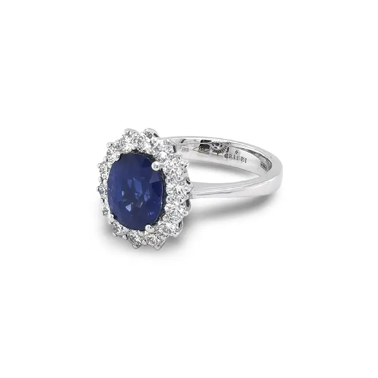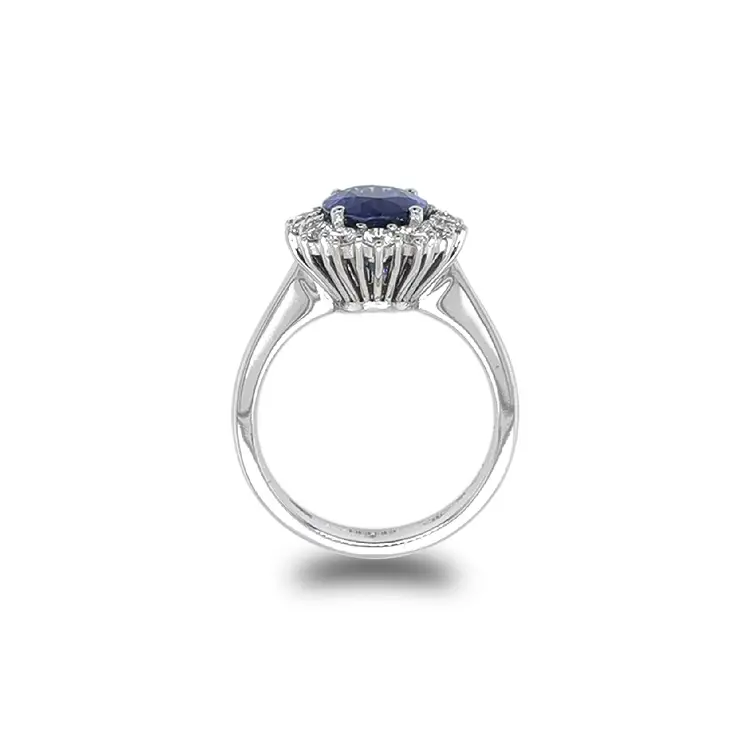 中央镶嵌一颗 天然蓝宝石,重 3.37 克拉,尺寸 9.09 × 7.45 × 5.69 毫米,采用 椭圆切割(Oval)。其深邃的 蓝色光泽 如夜空般宁静而神秘,散发着皇室般的气韵。