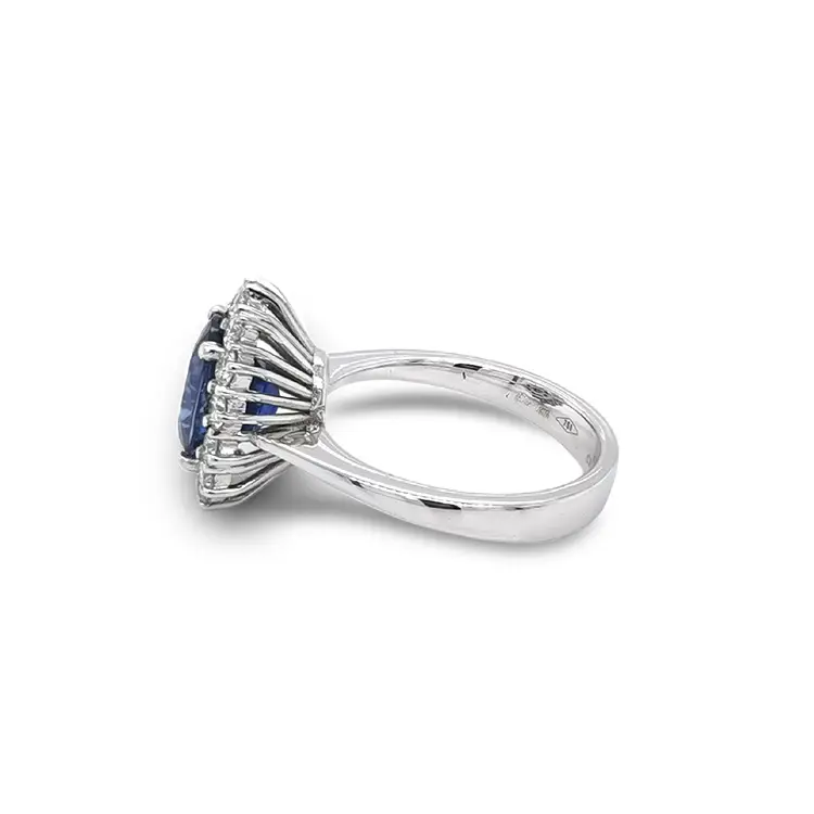周围环绕着 14 颗天然圆形钻石(Round),总重 0.78 克拉,颜色 G,净度 VS,尺寸 2.40 毫米。璀璨的钻石光环衬托出蓝宝石的纯净与高贵。