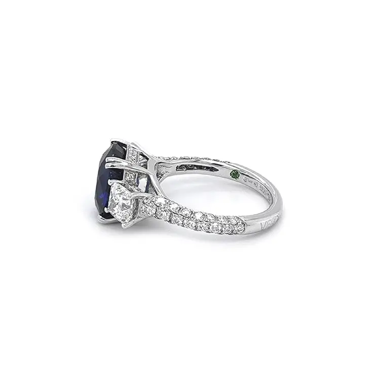 中央镶嵌一颗 5.57 克拉 天然蓝宝石(Cushion 切割,10.60 × 9.64 mm),其深邃蓝色象征平静与尊贵。两侧点缀 2 颗 Cushion 切割钻石 (总重 1.40 克拉,颜色 E,净度 VVS1),外圈环绕 64 颗 圆形钻石 (总重 0.72 克拉,颜色 F–G),璀璨光影交织。