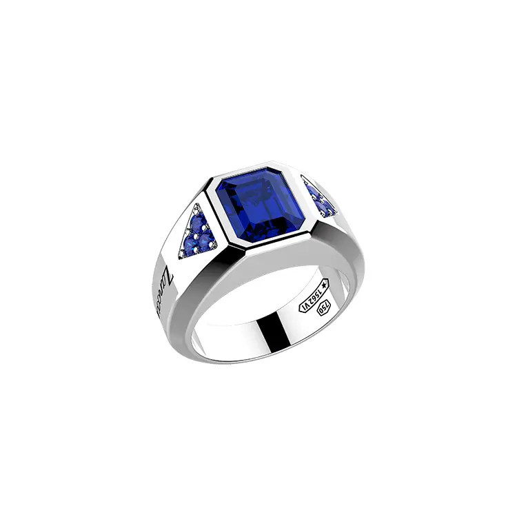 采用 18K 黄金(750/1000),材质为 白金,表面 亮面抛光。主石为 蓝色蓝宝石,重 3.80 克拉,祖母绿切割,1 颗。另配 6 颗天然蓝宝石,总重 0.42 克拉,圆形切割。