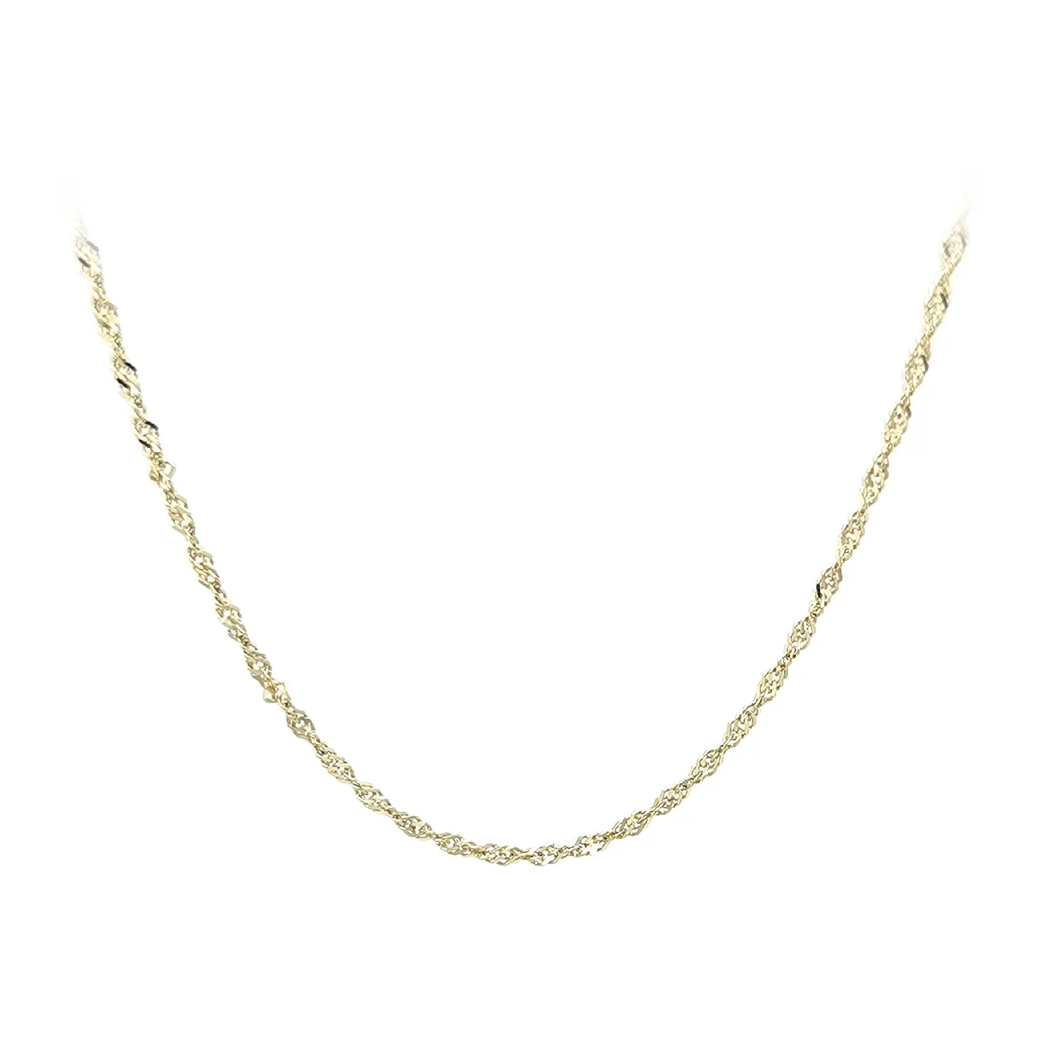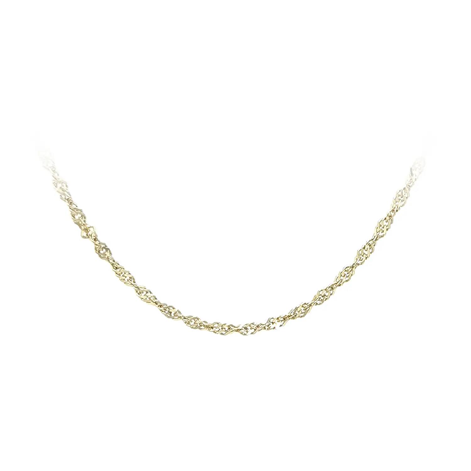 新加坡式黄金项链以精致的扭纹结构著称,能够优雅地反射光线,呈现出细腻而高雅的光泽。此款项链长度为50厘米,宽度为1.50毫米,造型均衡且富有质感。