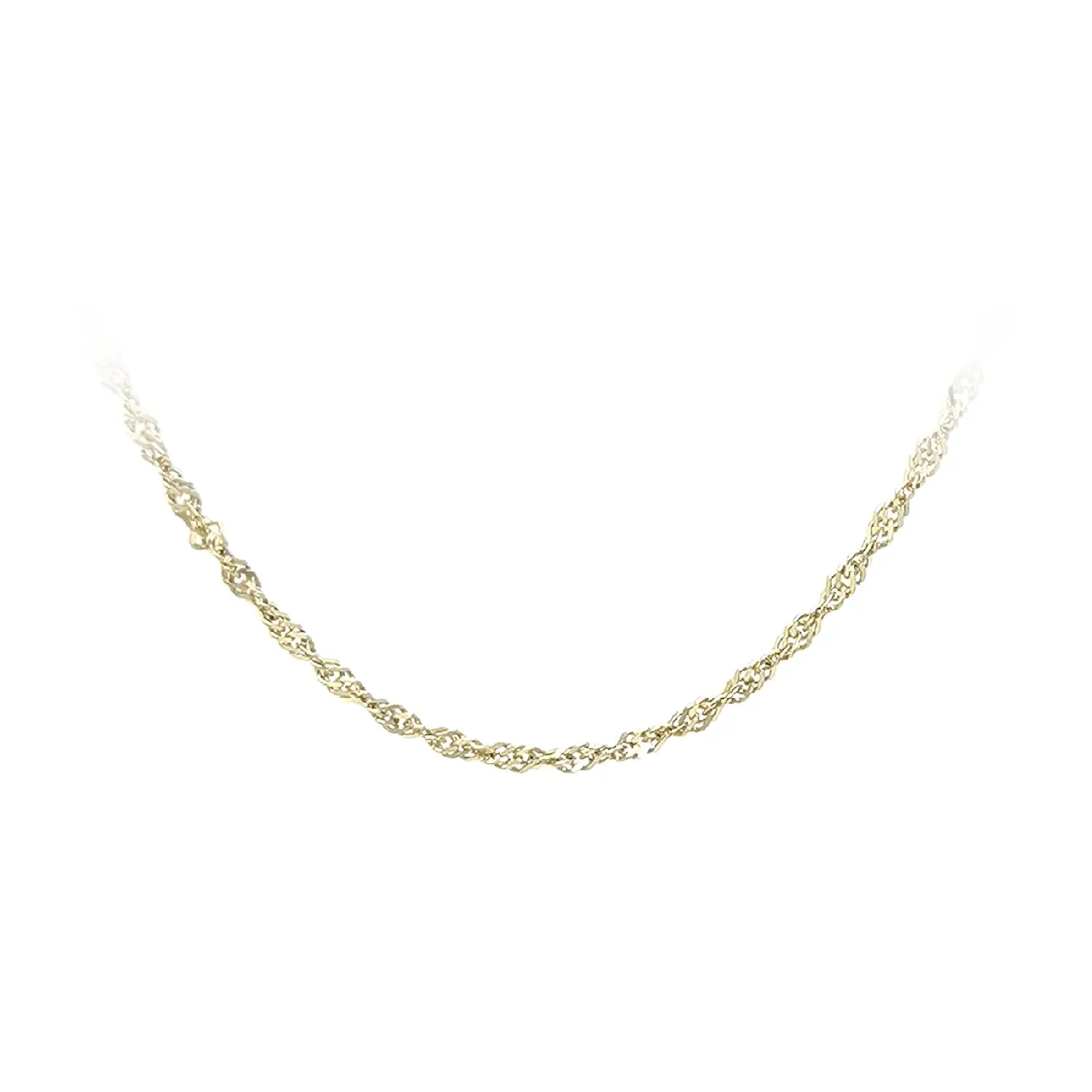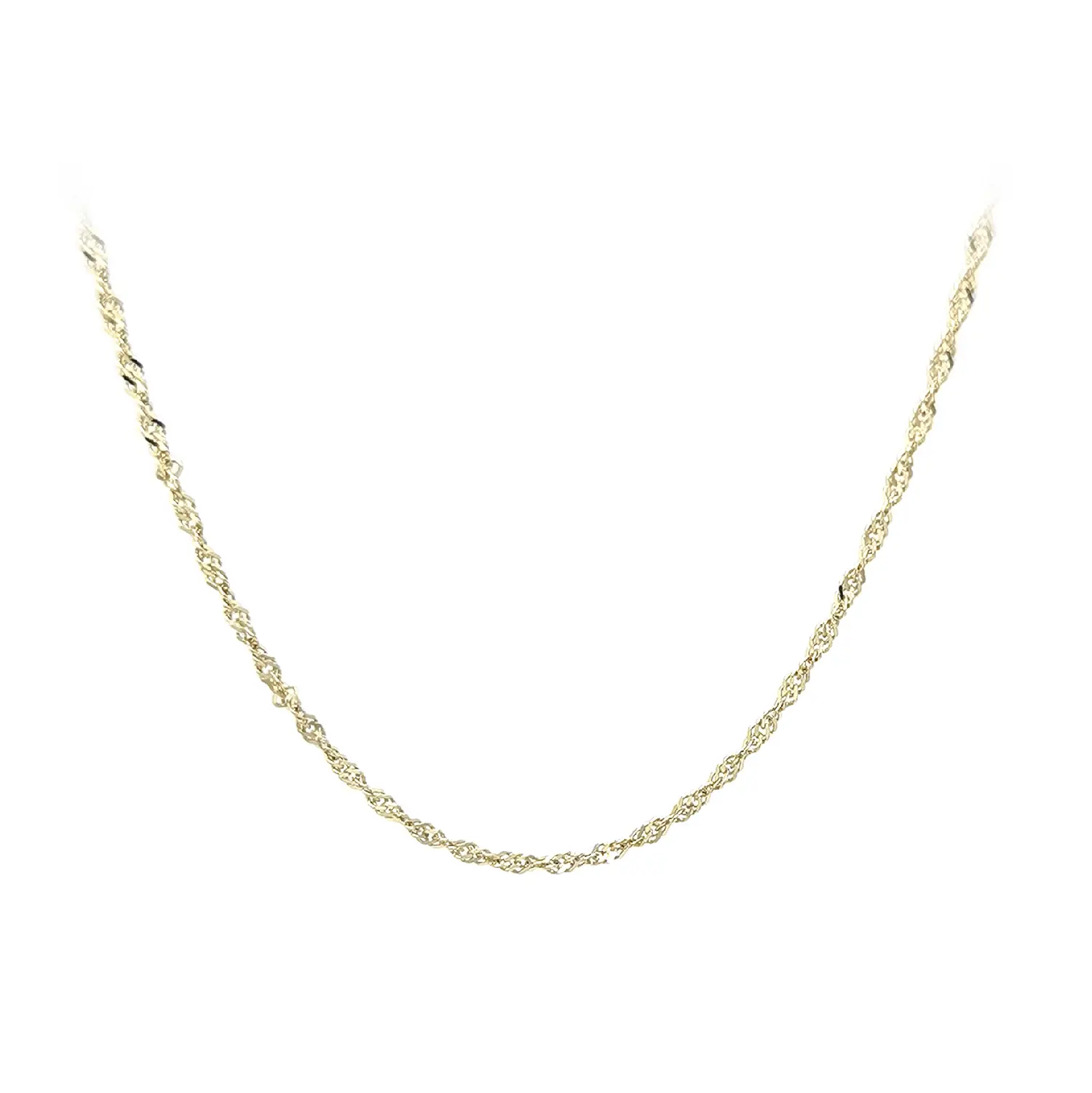 新加坡式黄金项链以精致的扭纹设计著称,能够优雅地反射光线,展现细腻而高雅的光泽。此款项链长度为45厘米,宽度为1.50毫米,佩戴时自然贴合颈部线条。
