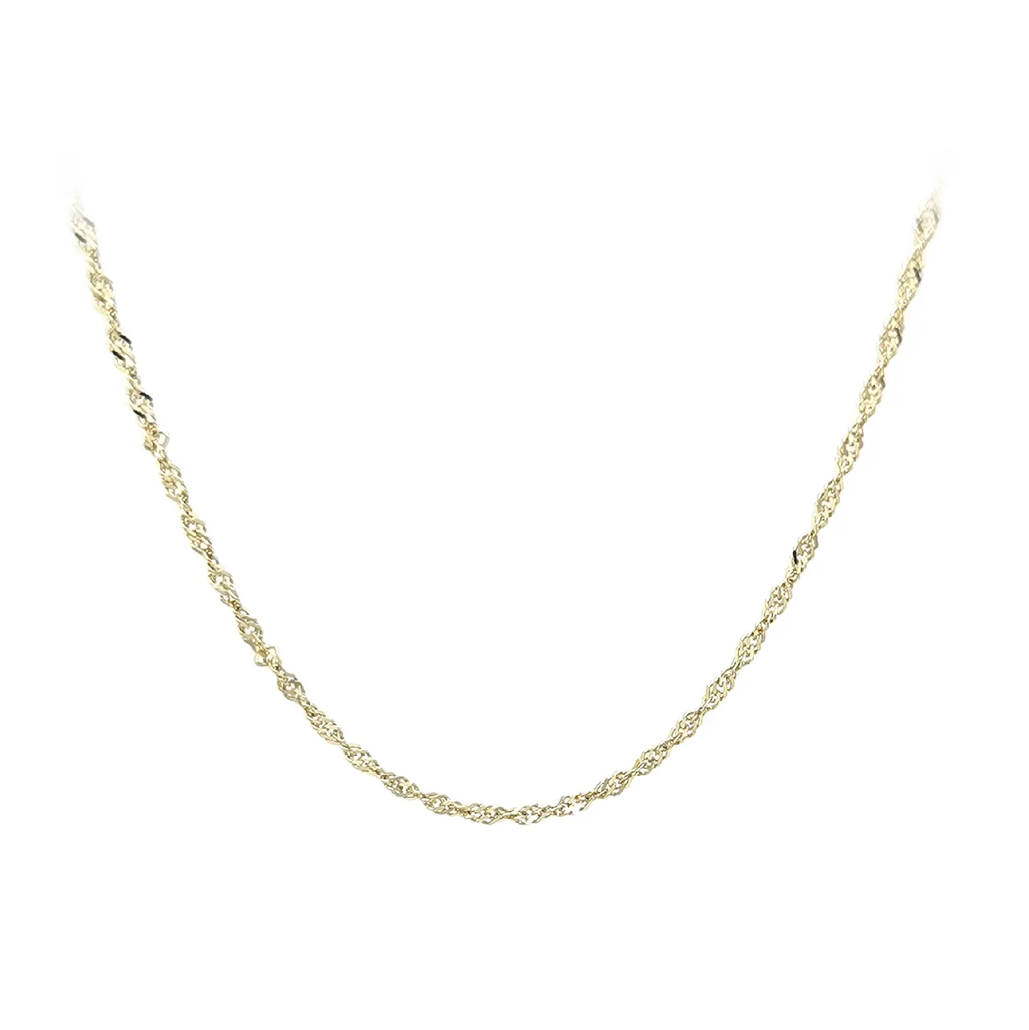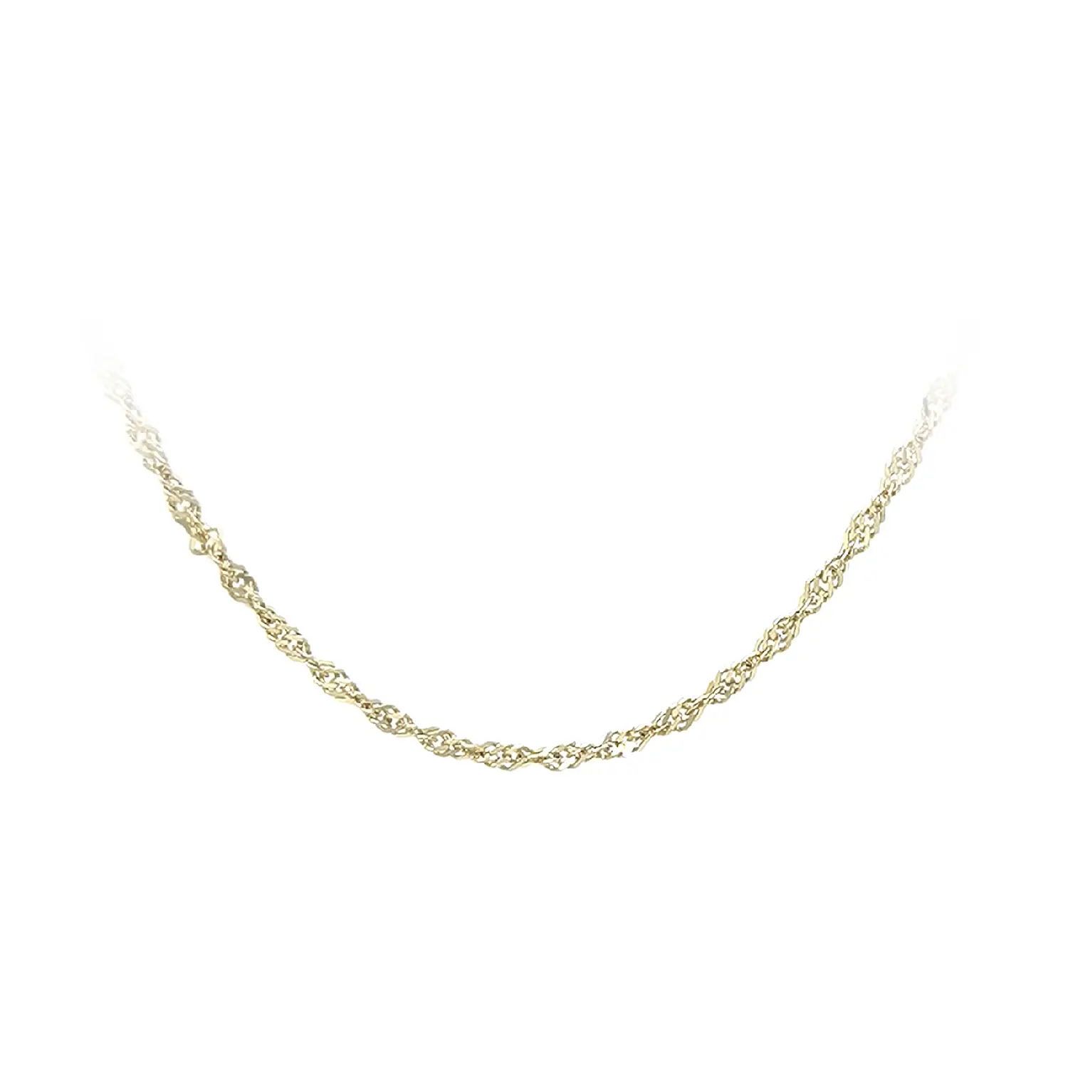 新加坡式黄金项链采用精致的扭绞结构设计,呈现出优雅的外观,并能自然地反射光线。1.50 毫米的宽度让项链看起来轻盈细腻,同时不失质感。