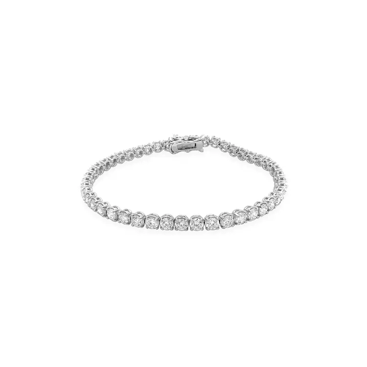 手链镶嵌47颗天然圆形钻石,总重6.68克拉,每颗直径3.30毫米,色级G、净度VS。钻石与白金完美融合,反射出流动的光影,散发出柔和而耀眼的火彩。