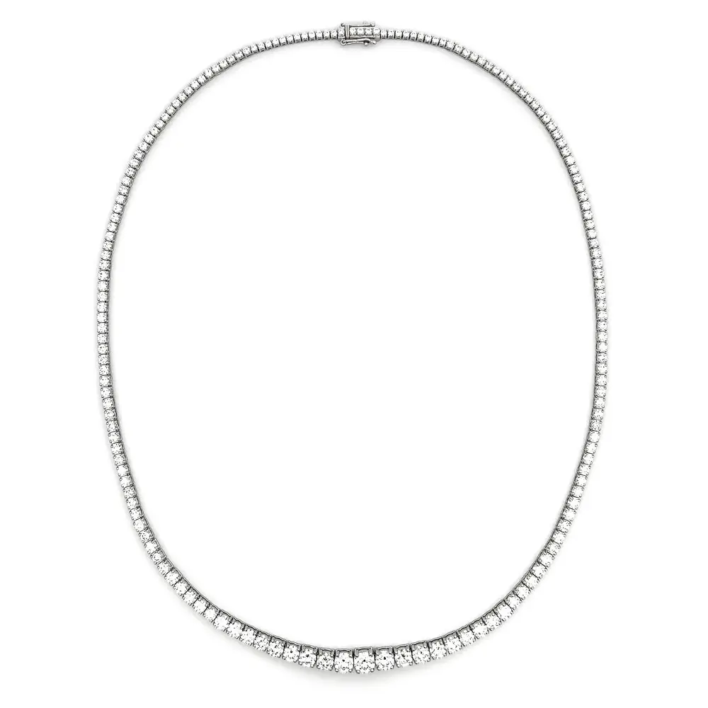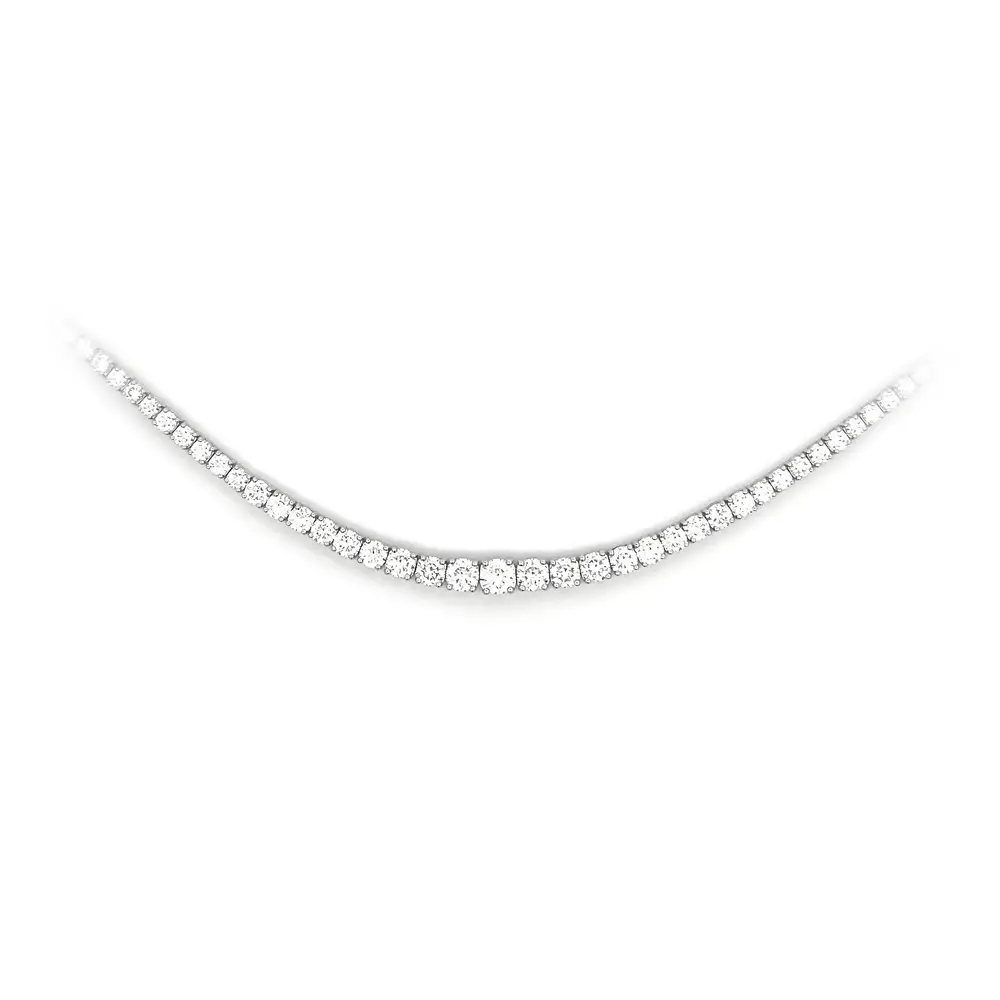 圆形明亮钻石(颜色 G,净度 VS)排列成一条流光溢彩的线,宛如环绕颈部的光辉之环。闪亮的白金底座突出金属与宝石的对比,营造出强烈视觉冲击与持久风格。