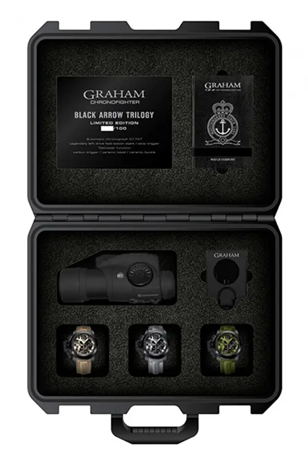 Graham Chronofighter Oversize Black Arrow Set 是大胆、技术精湛与 Graham 标志性风格的杰出体现。此型号限量仅 100 枚,是为那些勇于与众不同的男士打造的珍藏臻品。