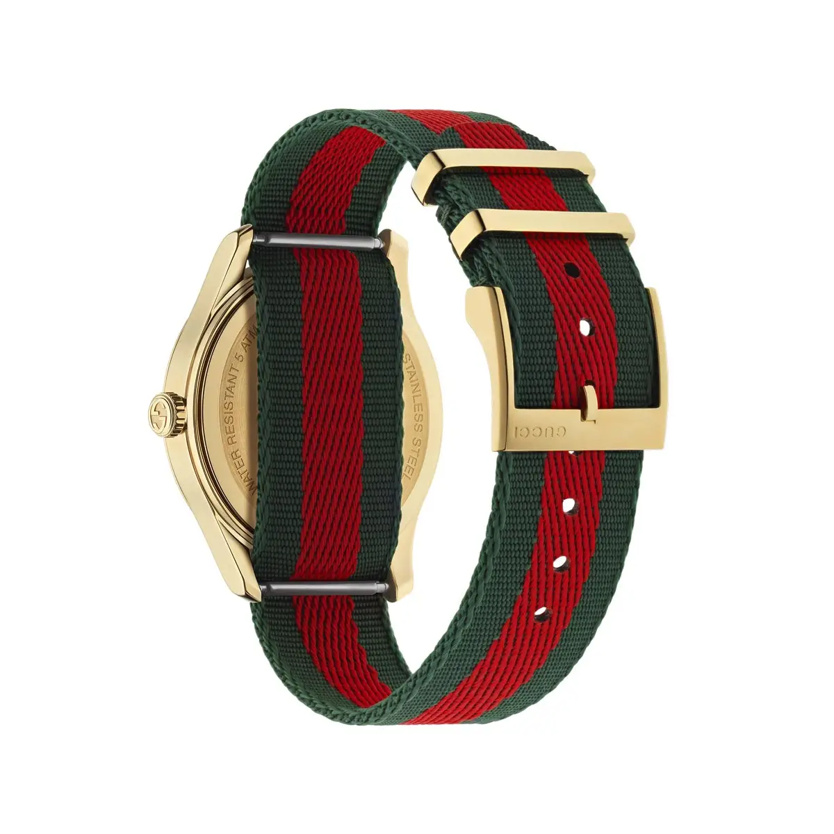 Gucci G-Timeless Contemporary YA126487B 将现代美学与品牌标志性元素相融合。佩戴于腕间,配备 38 毫米圆形表壳(不锈钢 / 黄镀金)、不锈钢 / 黄镀金表圈与 蓝宝石水晶镜面。整体搭配 双色(bicolor)模拟表盘及 双色织物表带与 针扣,从早到晚都显得清新有型。