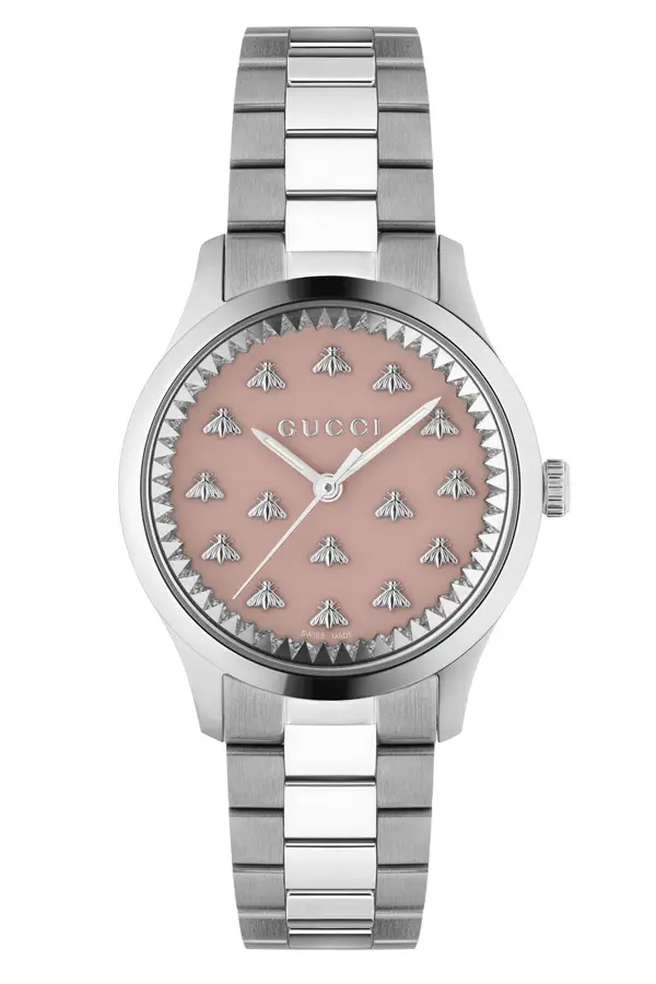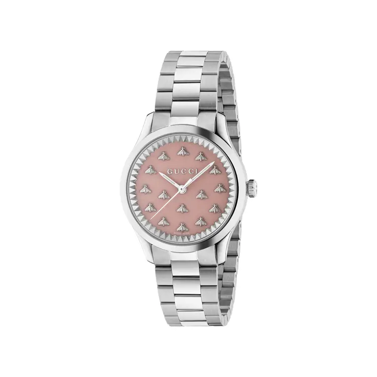 Gucci G-Timeless Multibee YA1265033 将现代美学与品牌标志性风格相结合。佩戴于腕间,配备 32 毫米圆形表壳(不锈钢)、蓝宝石水晶镜面与简洁不锈钢表圈。粉色模拟表盘与 不锈钢表链(银色)+ 折叠式表扣相呼应——日常百搭、经典耐看。