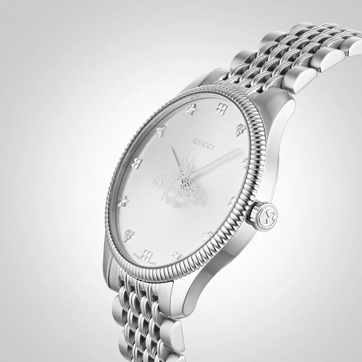 Gucci G-Timeless YA1264153 将简洁设计与品牌标志性风格相结合。佩戴于腕间,配备 36 毫米圆形表壳(不锈钢)、蓝宝石水晶镜面与简洁不锈钢表圈。银色模拟表盘搭配 不锈钢表链(银色)与折叠式表扣,整体观感紧凑且经典百搭。