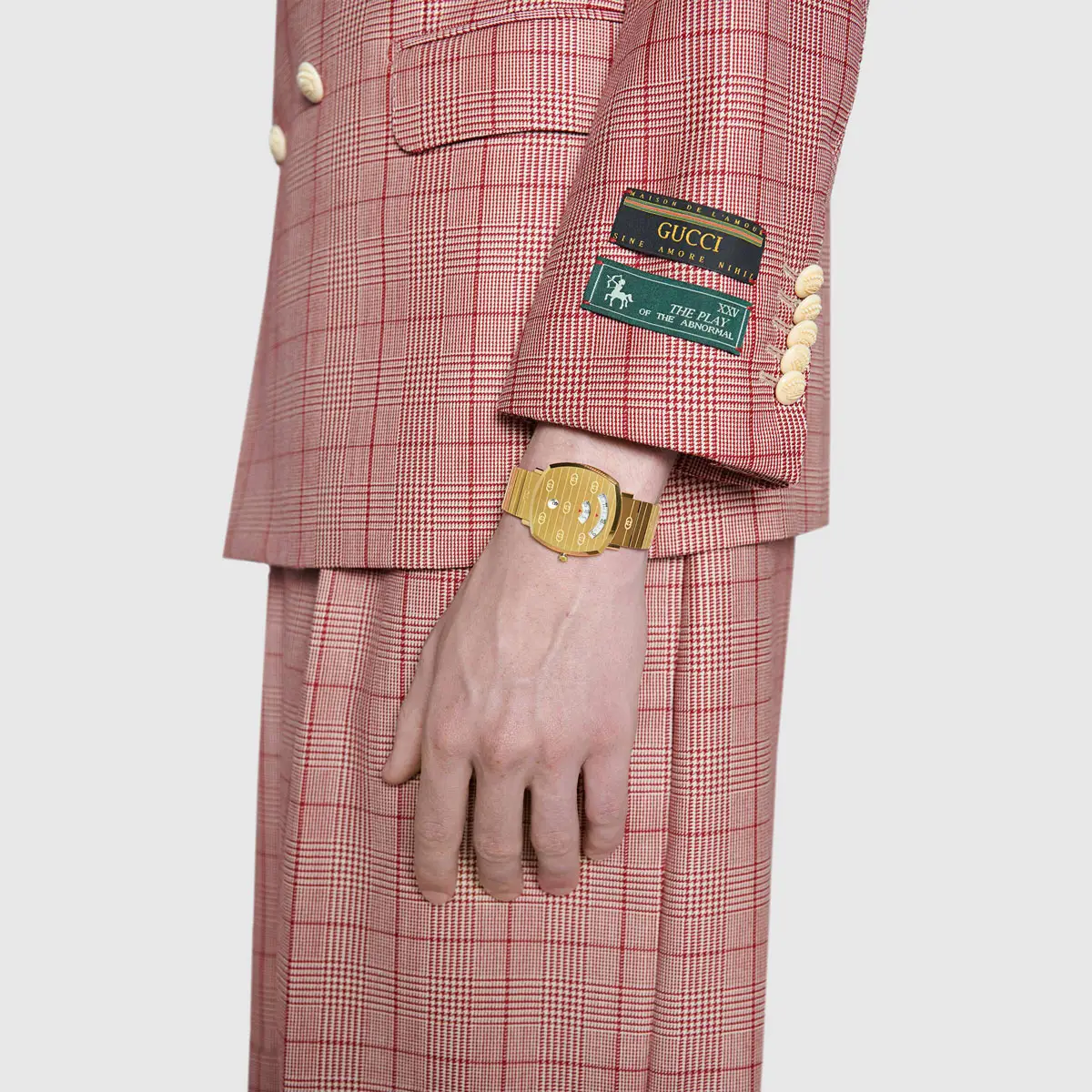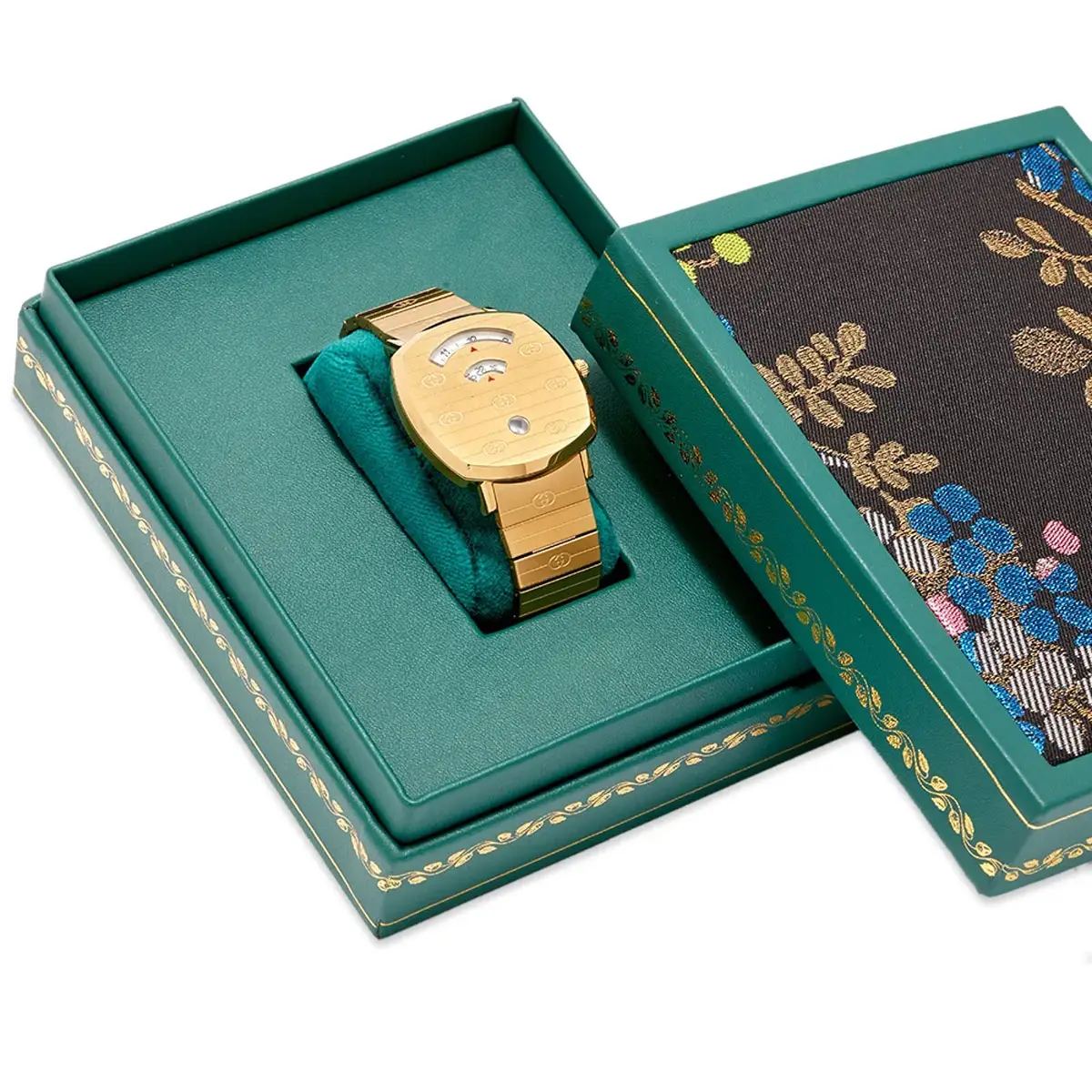 Gucci Grip YA157409 将现代极简与品牌标志性风格相融合。配备 38 毫米方形表壳(不锈钢 / 黄镀金)、蓝宝石水晶镜面,以及 不锈钢 / 黄镀金表圈。不锈钢黄镀金表链(金色)搭配折叠式表扣,整体在腕间呈现紧凑而奢华的质感。