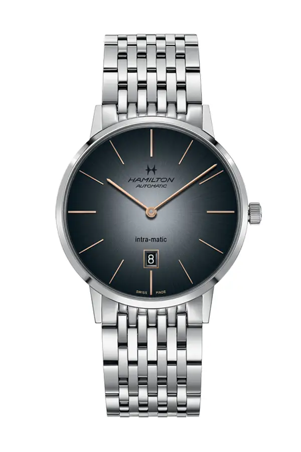 Hamilton 的奢华男士手表属于 American Classic 系列,尤其适合那些希望彰显魅力和自信的男士。圆形灰色表盘上不仅有独特的表盘和指针,还有日期显示。优雅的银色表带由精钢制成,完美彰显了该表款的经典外观。