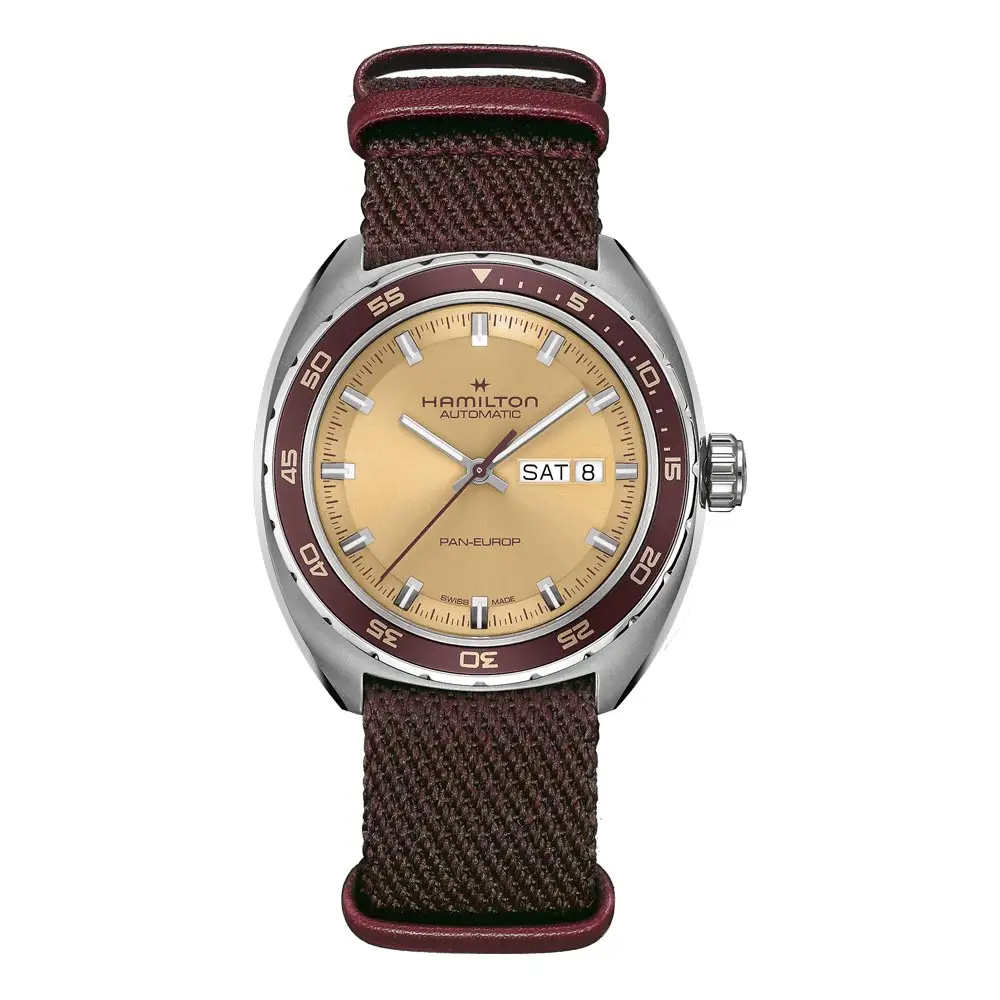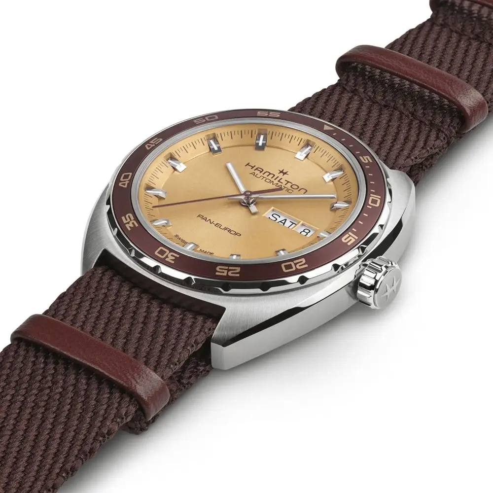 该款腕表具备5 ATM(50 米)防水性能,配有米色皮革表带与折叠式表扣,与整体复古设计相得益彰。Hamilton Pan Europ 是钟爱大胆却永不过时风格,并欣赏品牌 赛车传统精神 的男士理想之选。