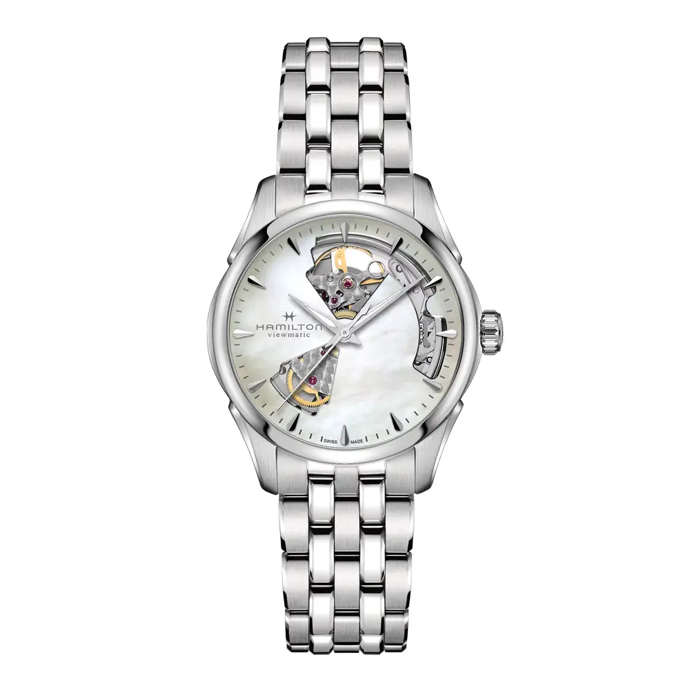 Hamilton Jazzmaster Open Heart H32215190 将优雅气质与瑞士机械制表的精准完美融合。精致的 36 毫米精钢表壳搭配迷人的 珍珠母贝表盘,配有标志性的 Open-Heart 镂空窗口,让机芯的律动一览无余。表盘的柔和光泽与精细装饰赋予腕表奢华特质,既适合日常佩戴,也适合作为出席特殊场合的点睛之笔.