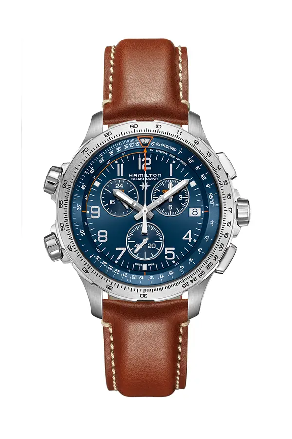 Hamilton 的 Khaki Aviation X-Wind GMT Chrono Quartz H77922541 男士手表不仅能显示时间,还能显示日期、计时相关读数以及与阵风相关的波动。坚固耐用的 46 毫米精钢表壳与厚实的棕色皮表带相结合,使这款手表给人留下深刻印象。所有喜欢运动的男士都会很高兴知道,他们可以佩戴这款手表游泳。
