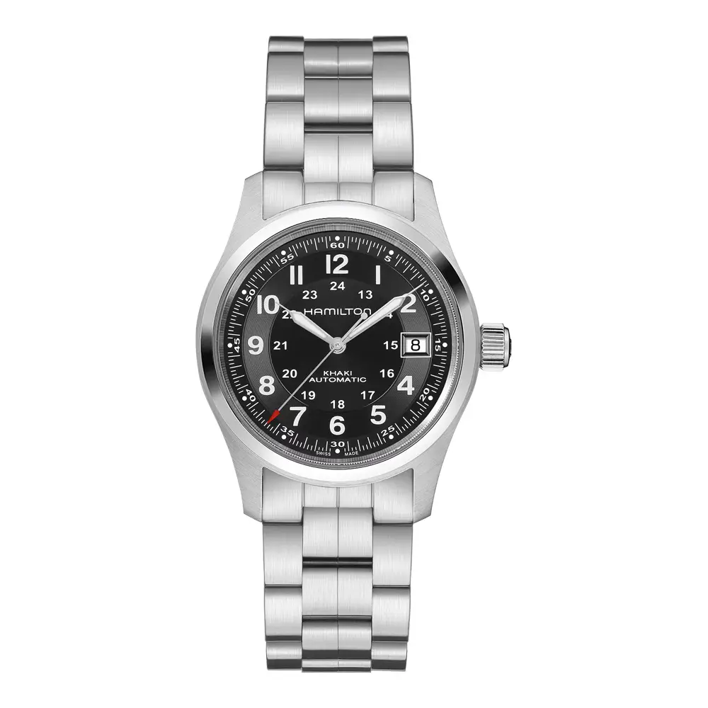 HAMILTON 男士手表以其独特的设计吸引了众多目光。Khaki Field 系列奢华手表在任何情况下都能吸引目光。奢华的 38 毫米精钢表壳与精钢表带相得益彰。圆形模拟表盘使手表的整体设计更加生动。腕表搭载自动上链机械机芯。