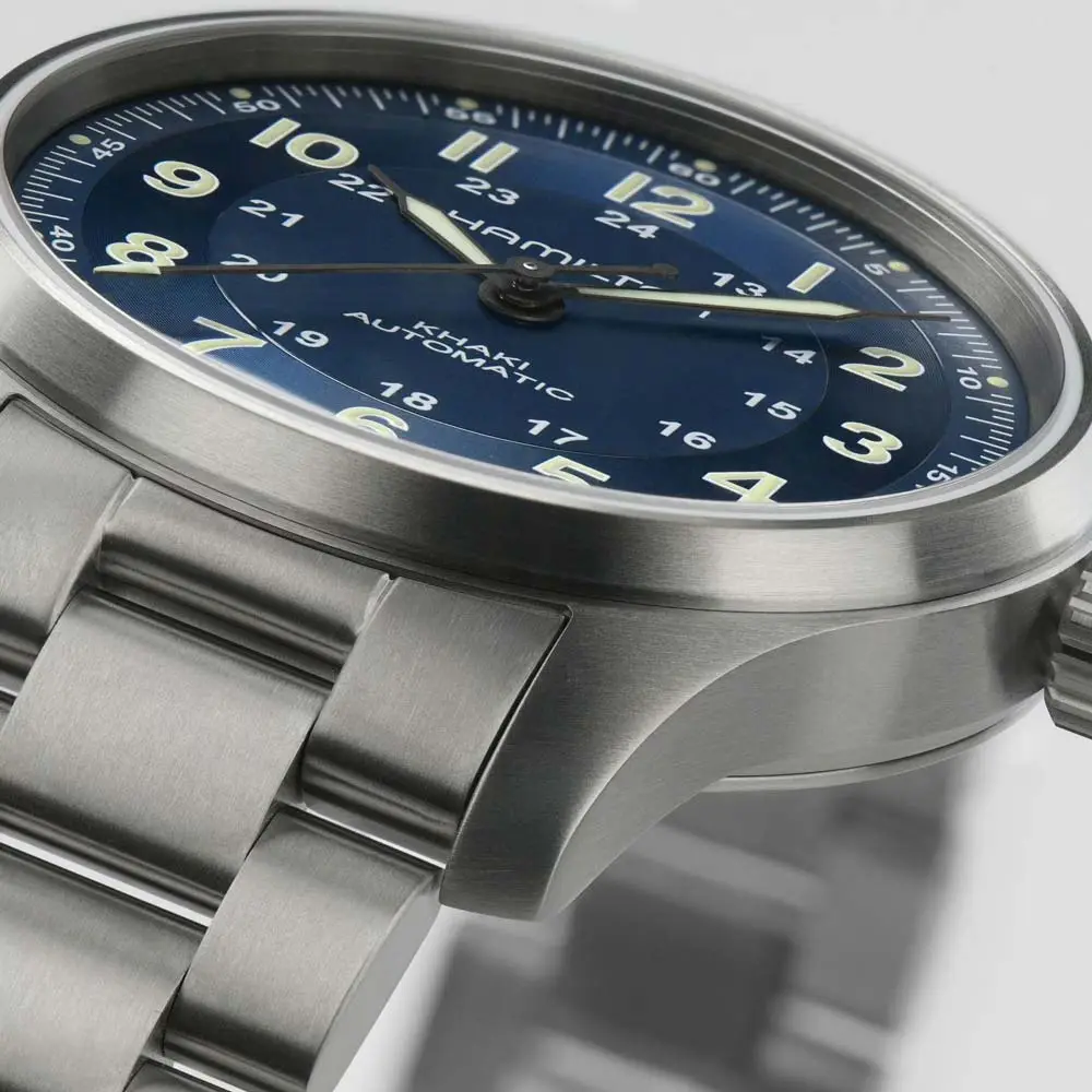 Hamilton Khaki Field Titanium Auto H70545140是一款坚固耐用的户外表款,灵感源自军事设计。42 毫米表壳由轻巧耐用的钛金属制成,搭配钛金属表链,佩戴极为舒适。蓝色哑光表盘搭配独特的阿拉伯数字时标,即使在恶劣环境下也清晰易读。