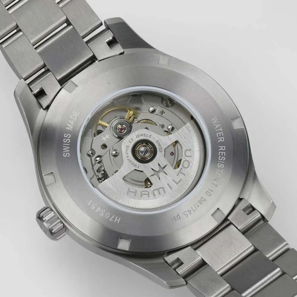 H-10 自动机芯是这款腕表的核心,配备现代 Nivachron™ 防磁螺旋装置,动力储备长达 80 小时。透过透明蓝宝石表盘,精密的瑞士机芯一览无余,彰显了整个表款的技术品质。