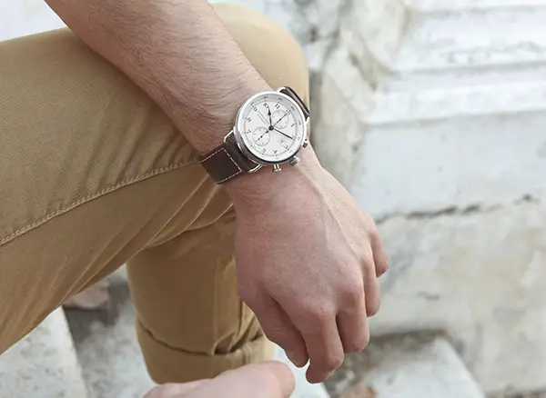 优雅的白色指针式表盘不仅清晰显示时间,还配备计时功能和日期显示,非常适合注重细节的男士。棕色皮革表带配针扣佩戴舒适,固定牢靠,增添优雅气质。