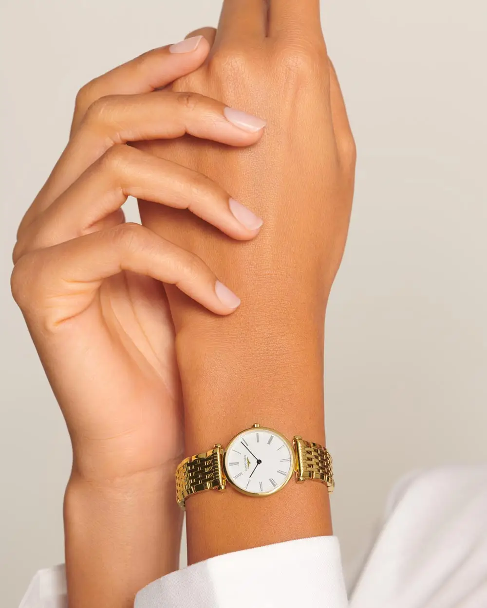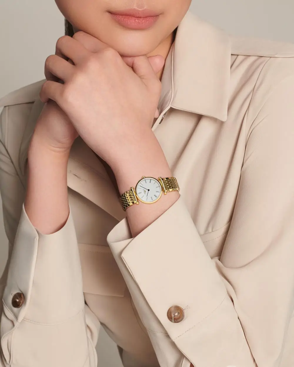 白色表盘饰以 黑色罗马数字与纤细指针,呈现经典雅致的风格。极简设计完美体现 La Grande Classique 系列的特质,突显腕表高贵的美学。