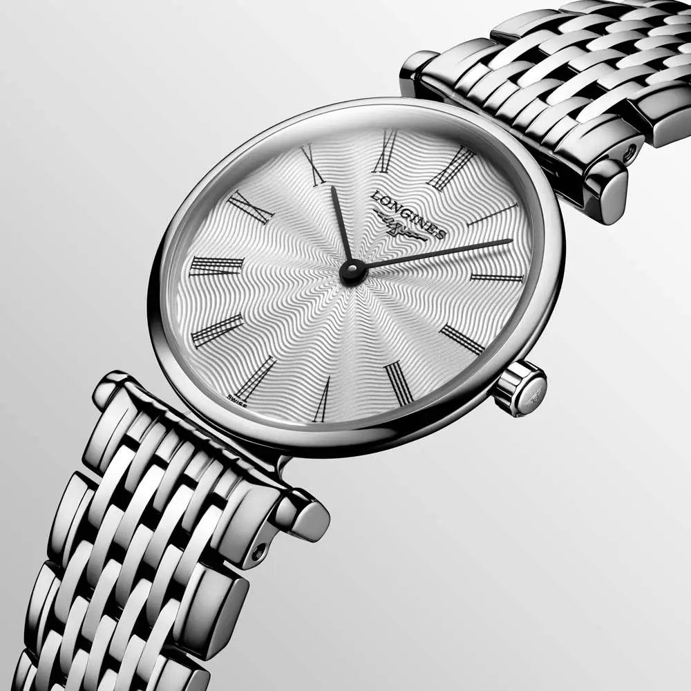 腕表搭载石英机芯 L209,确保精准可靠。配备精钢表链与折叠扣,具备 30 米 (3 ATM) 防水性能,完美展现 浪琴 La Grande Classique 系列的精致气质。