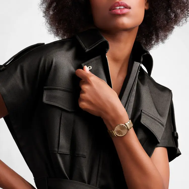 镶嵌精准钻石的金色模拟表盘 突显纤细的指针与时标 — 在低调奢华之处见真章。