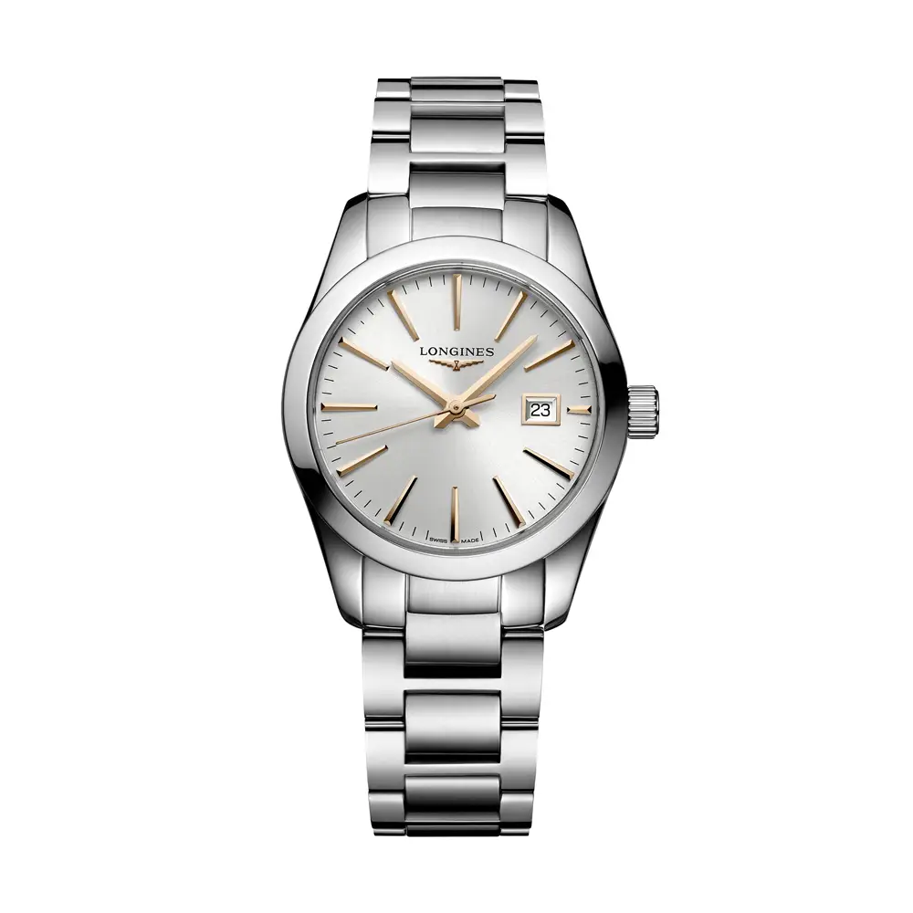 精钢表链结合抛光与拉丝工艺,配备 三重安全折叠表扣,佩戴舒适稳固。Conquest Classic L2.286.4.72.6 是女性的理想之选,适合追求 经典、可靠与优雅 的日常腕表。