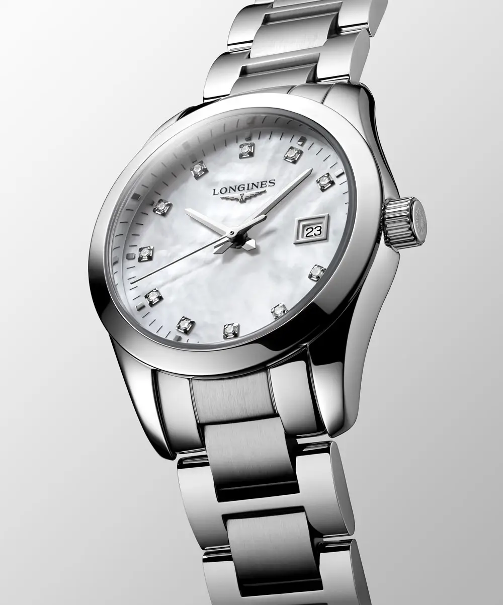Longines 浪琴 Conquest Classic L2.286.4.87.6 是一款女士腕表,将优雅气质与珠宝细节融合瑞士制表精度。29.5 毫米精钢表壳 搭配珍珠母贝表盘,镶嵌 11 颗钻石时标,散发精致光彩。日期显示位于 3 点钟位置。