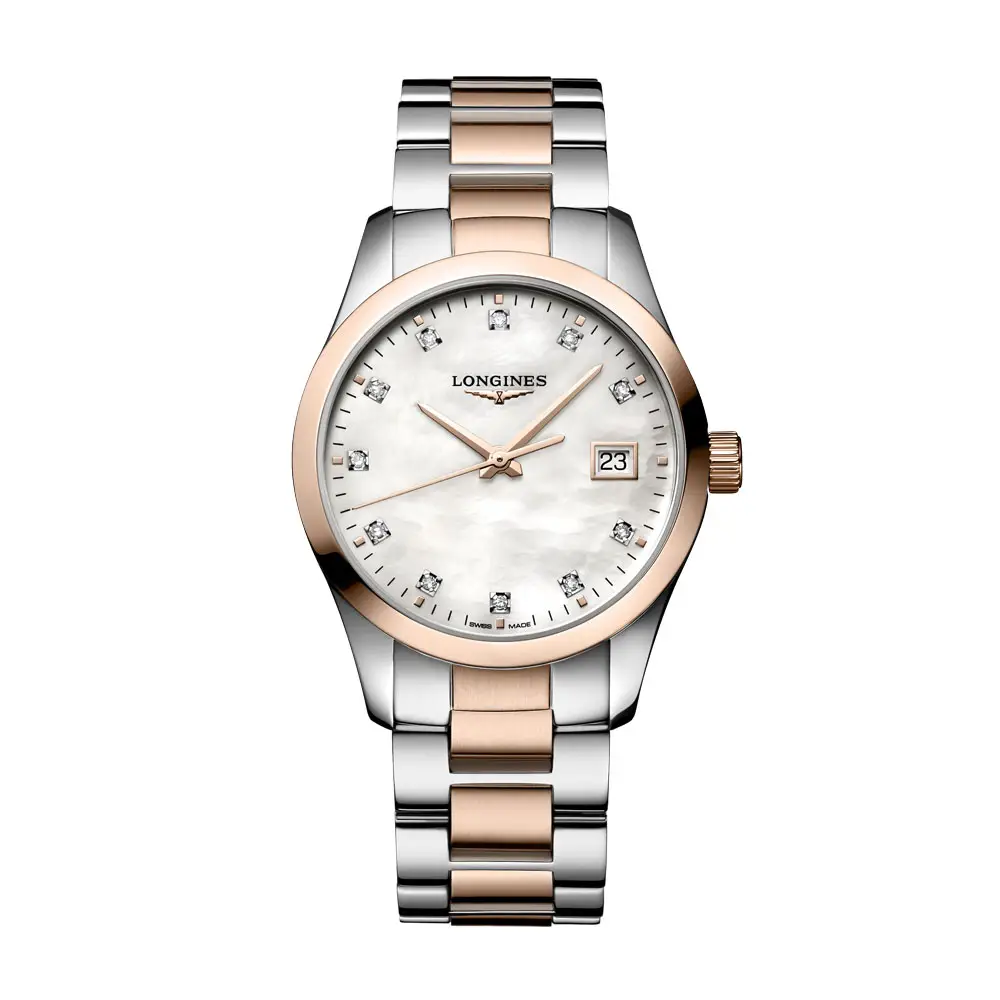 Longines 浪琴 Conquest Classic L2.386.3.87.7 是标志性 Conquest 系列的优雅女士款,融合珠宝般的细节与实用功能。34 毫米精钢表壳 搭配红色 PVD 装饰,衬托白色珍珠母贝表盘,并镶嵌 11 颗钻石时标。日期显示位于 3 点钟位置。