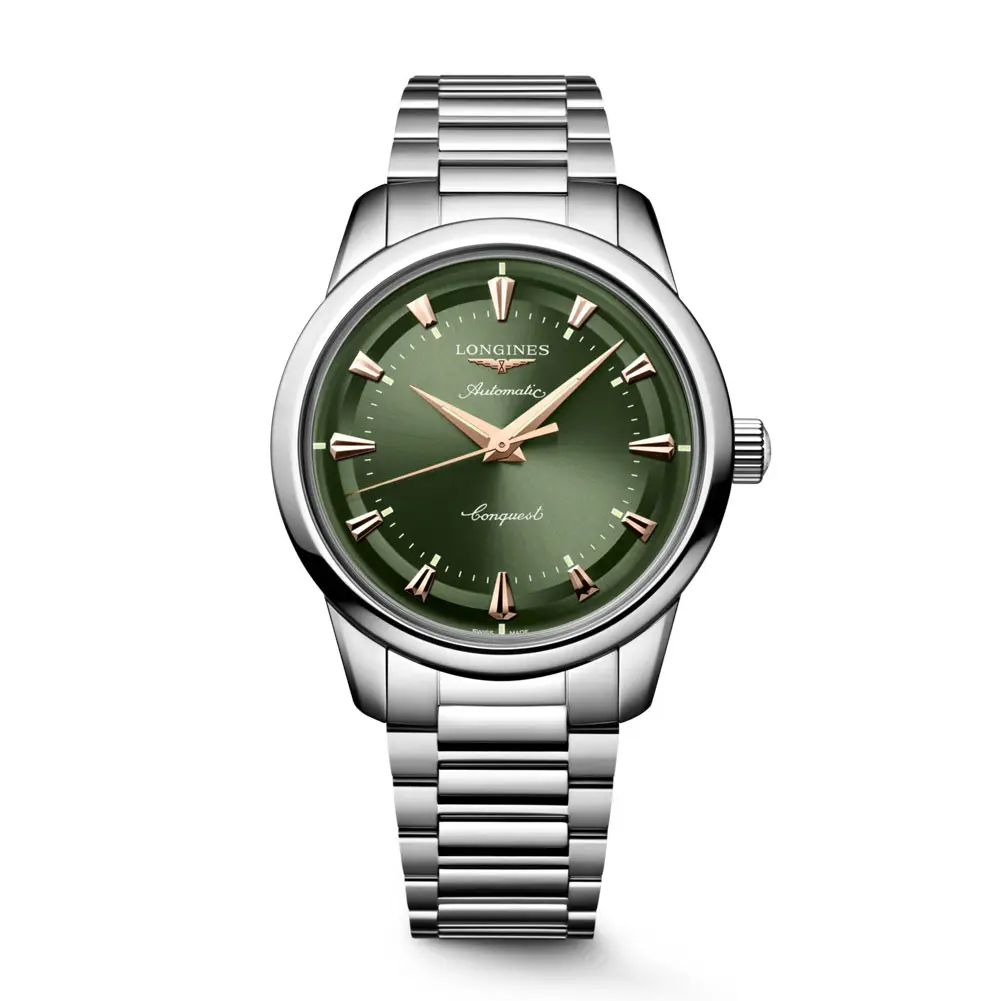 浪琴表康卡斯传承系列40毫米腕表向品牌上世纪50年代的经典设计致敬,以现代理念展现优雅与永恒。40 毫米精钢表壳搭配弧度柔和的防反光蓝宝石水晶表镜。绿色漆面表盘具有太阳纹效果,抛光刻度和指针均涂有 Super-LumiNova® 夜光涂层,一眼便能吸引人的眼球。