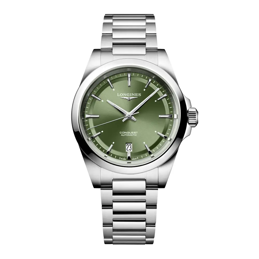 Longines Conquest L3.720.4.02.6 是一款男士自动机械腕表,将运动风格与 Conquest 系列的优雅设计相结合。表壳直径 38 mm,采用 不锈钢材质,并配备旋入式表冠,提高日常使用的耐用性。腕表采用 绿色太阳纹表盘,搭配立体时标和夜光元素,在弱光环境下也具备良好的可读性。