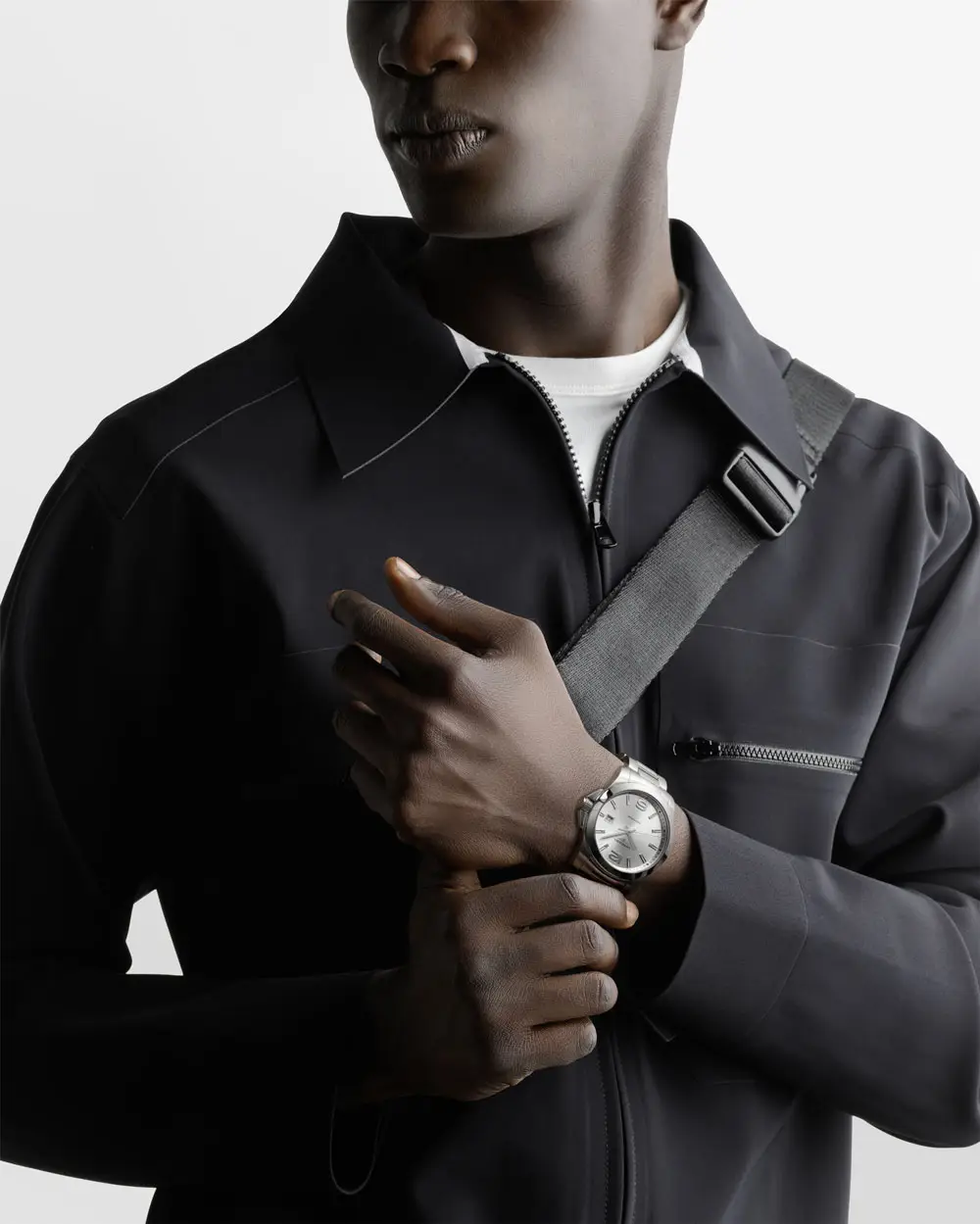 银色太阳纹表盘 搭配 阿拉伯数字、刻度与夜光指针,确保在任何光线条件下的清晰读时。3 点钟位置设有实用的 日期窗口,凸显腕表的功能特性。