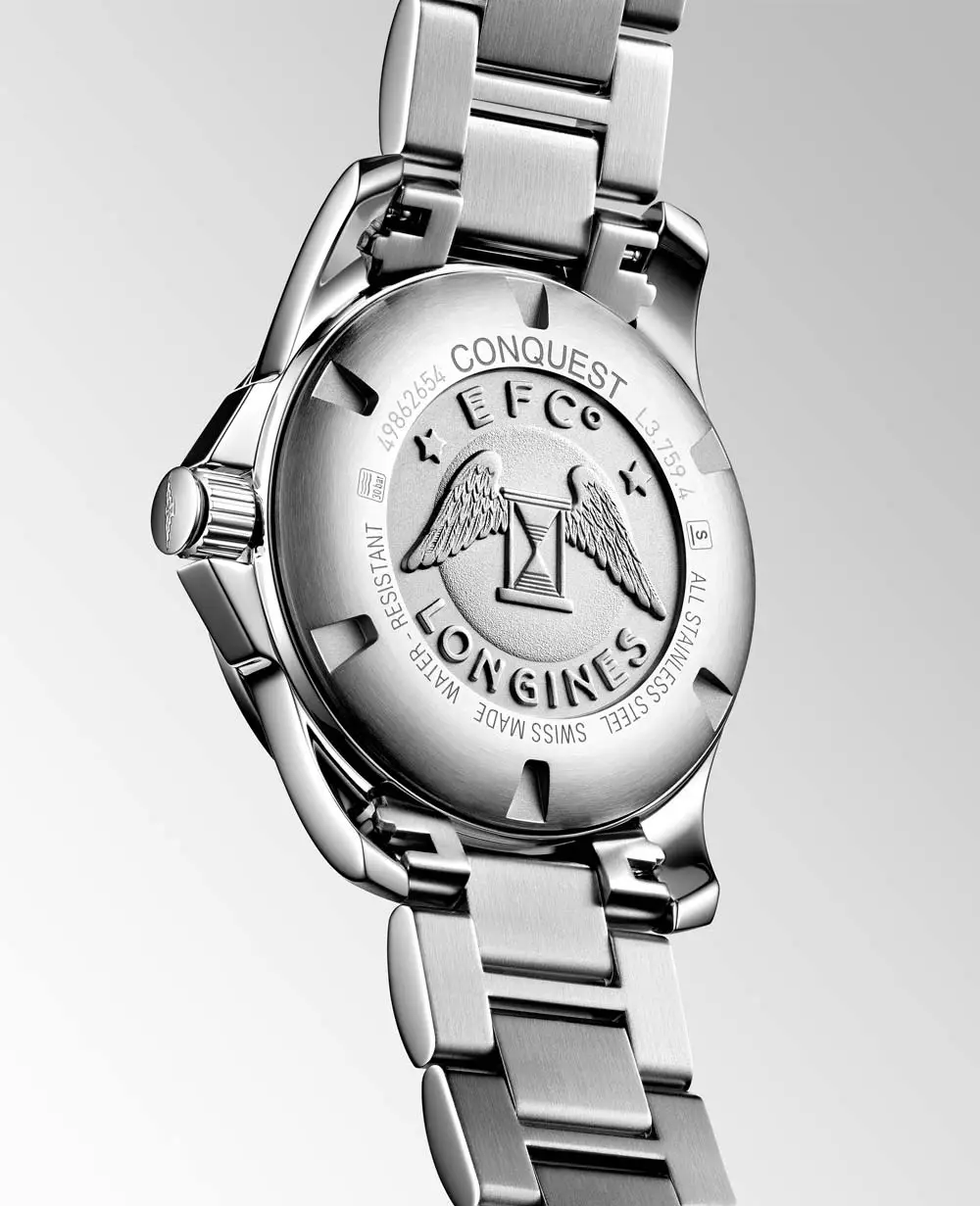 腕表内部搭载 石英机芯 L157,提供精准与无忧的使用体验。配备 精钢表链与三重安全折叠表扣,兼顾舒适、安全与运动优雅。此款腕表完美体现了 Conquest 系列的理念 —— 耐用性、性能与瑞士传统。