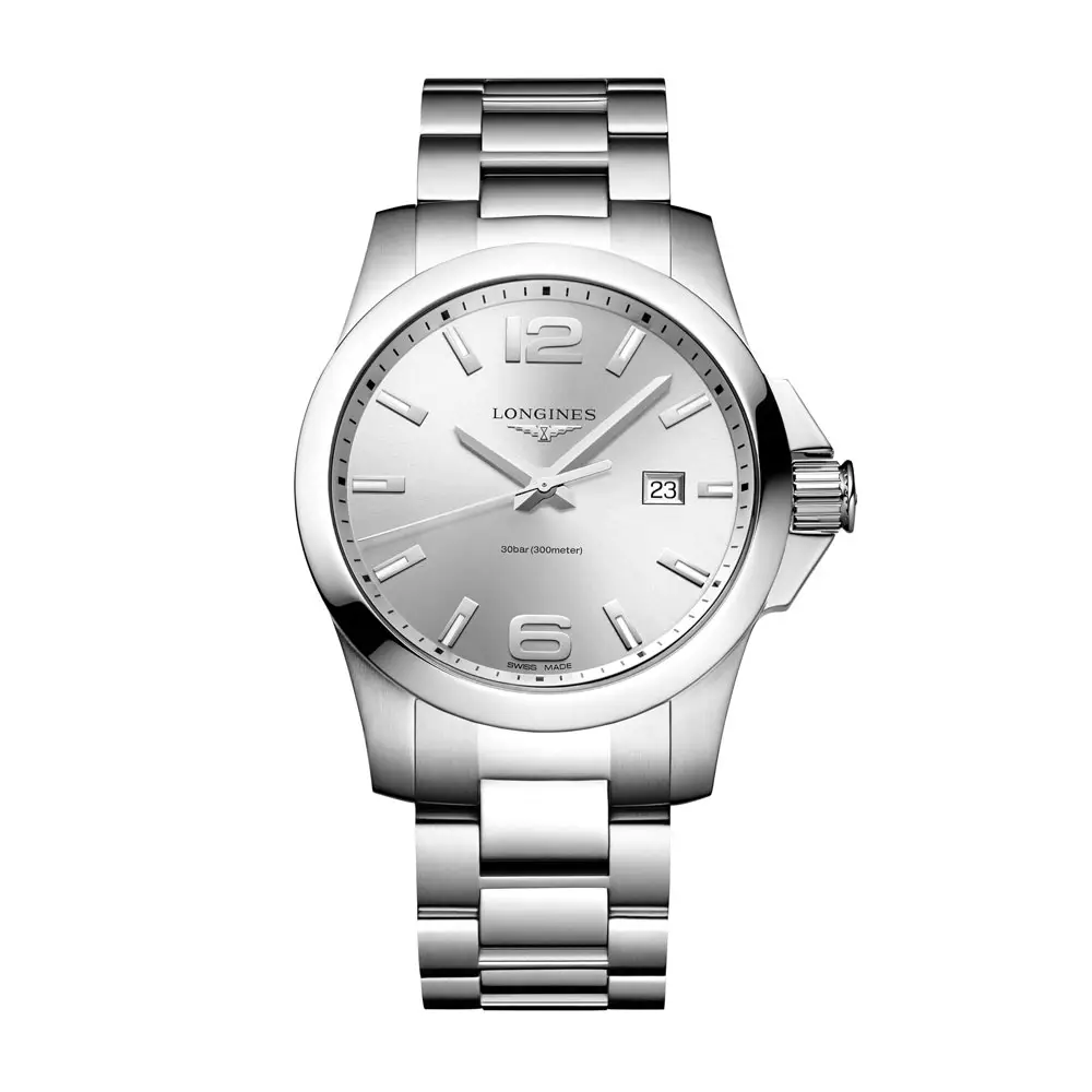 Longines Conquest L3.760.4.76.6 将坚固的运动风格与优雅设计完美结合,既适合活跃的生活方式,也适合日常佩戴。43 毫米的不锈钢圆形表壳 线条简洁,外观精致;搭配 银色表盘和清晰的时标,展现非凡气质。