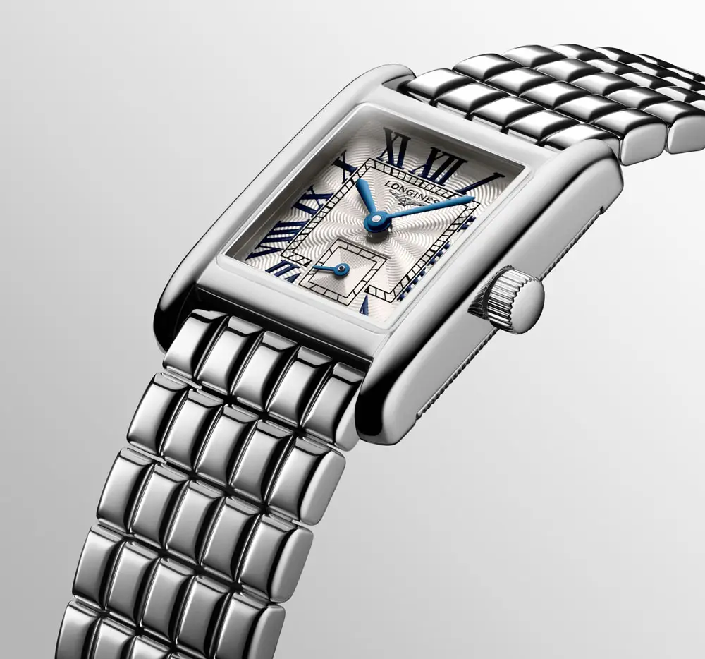Longines 浪琴 Mini DolceVita L5.200.4.71.6 是一款女士腕表,以更为精致的形式展现了 DolceVita 系列的优雅气质。21.50 × 29.00 毫米精钢表壳 搭配银色 “flinqué” 表盘,饰以细腻纹理和蓝色指针,尽显高雅与精致。