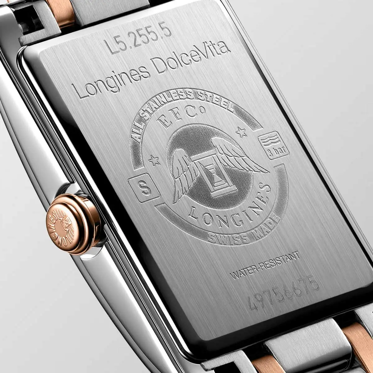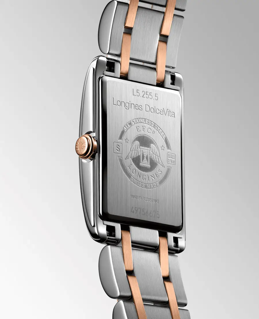 配备 双色精钢与玫瑰金镀层表链,搭配三重安全折叠表扣与按压式开合,佩戴舒适稳固。DolceVita L5.255.5.75.7 是女性的理想选择,兼具 优雅、精致与多功能性,无论日常佩戴还是特别场合皆宜。